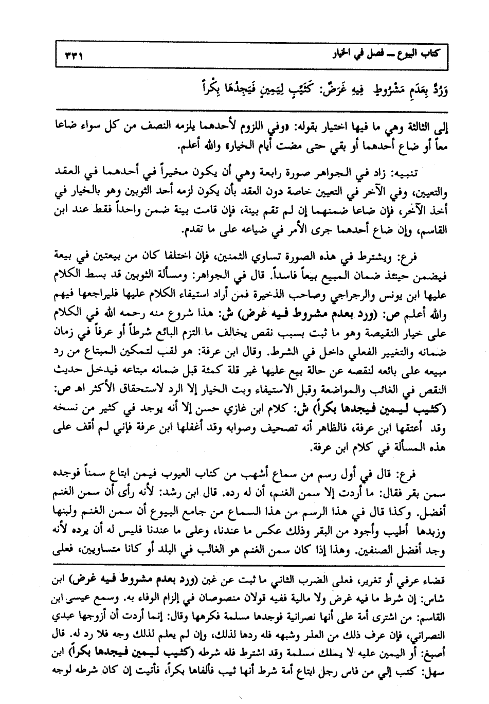فرع: ويشترط في هذه الصورة تساوي الثمنين، فإن اختلفا كان من بيعتين في بيعة فيضمن حينئذ ضمان المبيع بيعا فاسدا. قال في الجواهر: ومسألة الثوبين قد بسط الكلام عليها ابن يونس والرجراجي وصاحب الذخيرة فمن أراد استيفاء الكلام عليها فليراجعها فيهم، والله أعلم.ص: (ورد بعدم مشروط فيه غرض) ش: هذا شروع منه - رحمه الله - في الكلام على خيار النقيصة، وهو ما ثبت بسبب نقص يخالف ما التزم البائع شرطا، أو عرفا في زمان ضمانه، والتغيير الفعلي داخل في الشرط، وقال ابن عرفة: هو لقب لتمكين المبتاع من رد مبيعه على بائعه لنقصه عن حالة بيع عليها غير قلة كمائة قبل ضمانه مبتاعه فيدخل حديث النقص في الغائب والمواضعة وقبل الاستيفاء وبت الخيار إلا الرد لاستحقاق الأكثر ا هـ ص: (كثيب ليمين فيجدها بكرا) ش: كلام ابن غازي حسن إلا أنه يوجد في كثير من نسخه، وقد أعتقها ابن عرفة فالظاهر أنه تصحيف وصوابه، وقد أغفلها ابن عرفة فإني لم أقف على هذه المسألة في كلام ابن عرفة.