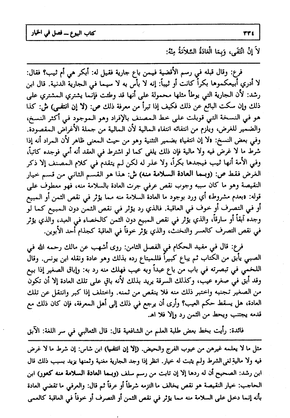 فرع: وقال قبله في رسم الأقضية فيمن باع جارية فقيل له: أبكر هي أم ثيب ؟ فقال: لا أدري أبيعكموها بكرا كانت، أو ثيبا، أنه لا بأس به لا سيما في الجارية الدنية. قال ابن رشد؛ لأن الجارية التي يوطأ مثلها محمولة على أنها قد وطئت فإنما يشتري المشتري على ذلك، وإن سكت البائع عن ذلك فكيف إذا تبرأ من معرفة ذلك ص: (لا إن انتفى) ش: كذا هو في النسخة التي قوبلت على خط المصنف بالإفراد، وهو الموجود في أكثر النسخ، والضمير للغرض، ويلزم من انتفائه انتفاء المالية؛ لأن المالية من جملة الأغراض المقصودة، وفي بعض النسخ لا إن انتفيا بضمير التثنية، وهو من حيث المعنى ظاهر؛ لأن المراد أنه إذا شرط ما لا غرض فيه، ولا مالية فإن ذلك يلغى كما لو اشترط في العبد أنه أمي فوجده كاتبا، وفي الأمة أنها ثيب فيجدها بكرا، ولا عذر له لكن لم يتقدم في كلام المصنف إلا ذكر الغرض فقط ص: (وبما العادة السلامة منه) ش: هذا هو القسم الثاني من قسم خيار النقيصة، وهو ما كان سببه وجوب نقص عرفي جرت العادة بالسلامة منه فهو معطوف على قوله: بعدم مشروط، أي ورد بوجود ما العادة السلامة منه مما يؤثر في نقص الثمن، أو المبيع، أو في التصرف، أو خوف في العاقبة فالذي رد يؤثر في نقص الثمن دون المبيع كما لو وجده آبقا، أو سارقا، والذي يؤثر في نقص المبيع دون الثمن كالخصاء في العبد والذي يؤثر في نقص التصرف كالعسر والتخنث والذي يؤثر خوفا في العاقبة كجذام أحد الأبوين.