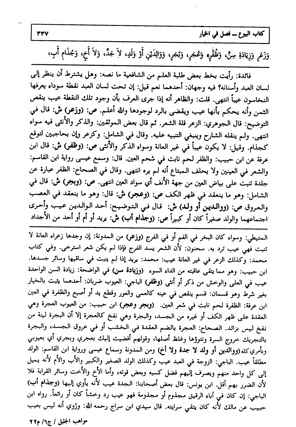 فائدة: رأيت بخط بعض طلبة العلم من الشافعية ما نصه: وهل يشترط أن ينظر إلى لسان العبد وأسنانه ؟ فيه وجهان أحدهما: نعم. قيل إن تحت لسان العبد نقطة سوداء يعرفها النخاسون عيبا انتهى. قلت: والظاهر أنه إذا جرى العرف بأن وجود تلك النقطة عيب ينقص الثمن وأنه يحكم بأنها عيب ويقضى بالرد لوجودها والله أعلم.ص: (وزعر) ش: قال في التوضيح قال الجوهري: الزعر قلة الشعر، ثم قال بعض الموثقين: والذكر والأنثى فيه سواء انتهى. ولم ينقله الشارح وينبغي التنبيه عليه، وقال في الشامل: وكزعر، وإن بحاجبين لتوقع كجذام، وقيل لا يكون عيبا في غير العانة، وسواء الذكر والأنثى.ص: (وظفر) ش: قال ابن عرفة عن ابن حبيب والظفر لحم نابت في شحم العين. قال: وسمع عيسى رواية ابن القاسم: والشعر في العينين، ولا يحلف المبتاع أنه لم يره انتهى. وقال في الصحاح: الظفر عبارة عن جلدة تنبت على بياض العين من جهة الأنف أي سواد العين انتهى.ص: (وبجر) ش: قال في الشامل، وهو ما ينعقد في ظهر الكف.ص: (وعجر) ش: قال: وهو ما ينعقد في العصب والعروق.ص: (ووالدين أو ولد) ش: قال في التوضيح: أحد الوالدين عيب وأحرى اجتماعهما والولد صغيرا كان، أو كبيرا ص: (وجذام أب) ش: يريد، أو أم، أو أحد من الأجداد