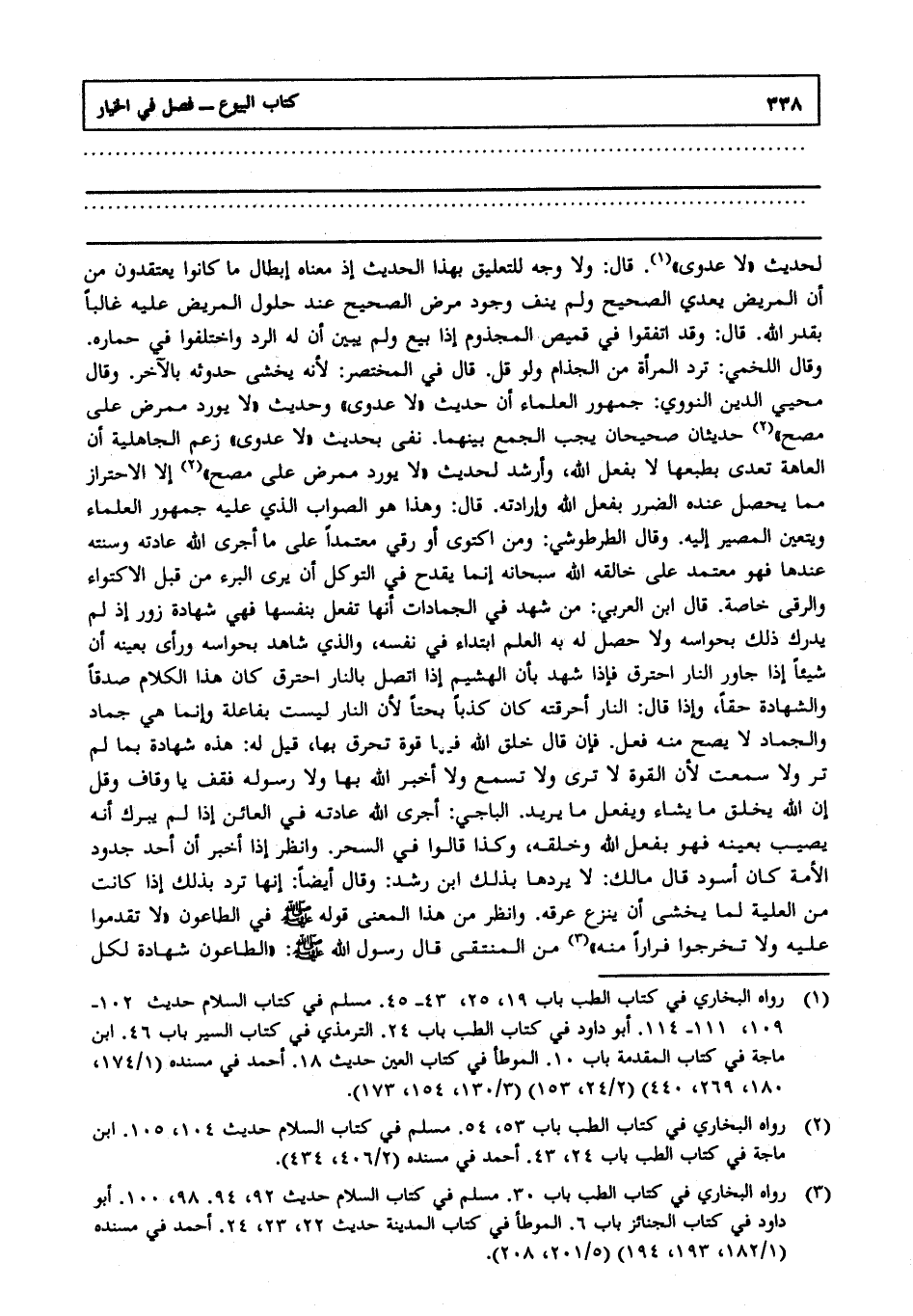 وَقَالَ مُحْيِي الدِّينِ النَّوَوِيُّ: جُمْهُورُ الْعُلَمَاءِ أَنَّ حَدِيثَ «لَا عَدْوَى» وَحَدِيثَ «لَا يُورِدَنَّ مُمْرِضٌ عَلَى مُصِحٍّ» حَدِيثَانِ صَحِيحَانِ يَجِبُ الْجَمْعُ بَيْنَهُمَا. نُفِيَ بِحَدِيثِ «لَا عَدْوَى» زَعْمُ الْجَاهِلِيَّةِ أَنَّ الْعَاهَةَ تُعْدِي بِطَبْعِهَا لَا بِفِعْلِ اللَّهِ، وَأَرْشَدَ لِحَدِيثِ «لَا يُورِدَنَّ مُمْرِضٌ عَلَى مُصِحٍّ» إلَّا الِاحْتِرَازَ مِمَّا يَحْصُلُ عِنْدَهُ الضَّرَرُ بِفِعْلِ اللَّهِ وَإِرَادَتِهِ. قَالَ: وَهَذَا هُوَ الصَّوَابُ الَّذِي عَلَيْهِ جُمْهُورُ الْعُلَمَاءِ وَيَتَعَيَّنُ الْمَصِيرُ إلَيْهِ.