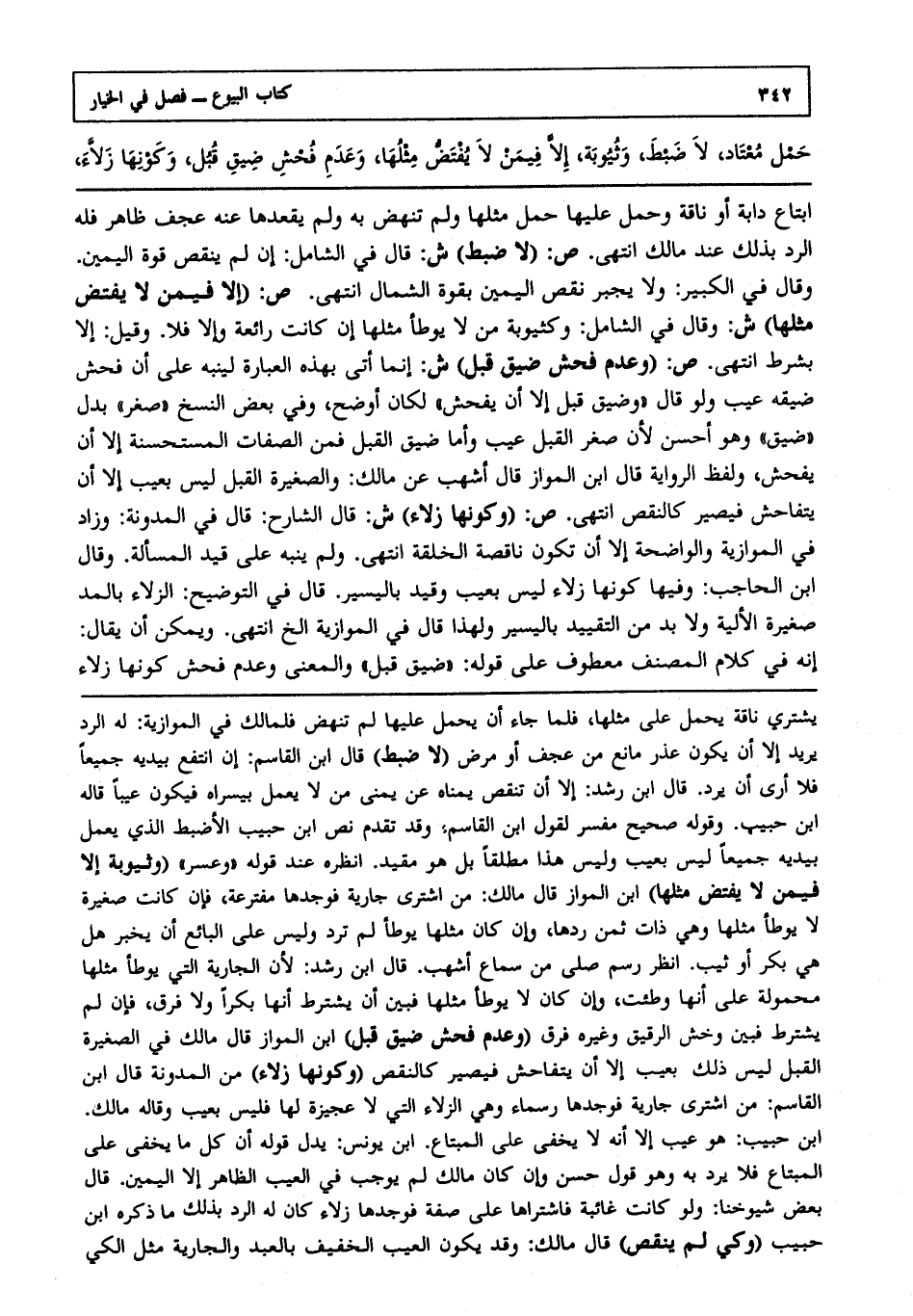 ابتاع دابة، أو ناقة وحمل عليها حمل مثلها، ولم تنهض به، ولم يقعدها عنه عجف ظاهر فله الرد بذلك عند مالك انتهى. ص: (لا ضبط) ش: قال في الشامل إن لم ينقص قوة اليمين، وقال في الكبير :، ولا يجبر نقص اليمين بقوة الشمال. انتهى ش: (إلا فيمن لا يفتض مثلها) ش: وقال في الشامل: وكثيوبة من لا يوطأ مثلها إن كانت رائعة وإلا فلا، وقيل إلا بشرط انتهى.ص: (وعدم فحش ضيق قبل) ش: إنما أتى بهذه العبارة لينبه على أن فحش ضيقه عيب، ولو قال: "وضيق قبل إلا أن يفحش" لكان أوضح، وفي بعض النسخ: صغر بدل ضيق، وهو أحسن؛ لأن صغر القبل عيب، وأما ضيق القبل فمن الصفات المستحسنة إلا أن يفحش، ولفظ الرواية: قال ابن المواز قال أشهب عن مالك: والصغيرة القبل ليس بعيب إلا أن يتفاحش فيصير كالنقص انتهى. ص: (وكونها زلاء) ش: قال الشارح: قال في المدونة: وزاد في الموازية والواضحة إلا أن تكون ناقصة الخلقة انتهى. ولم ينبه على قيد المسألة وقال ابن الحاجب: وفيها كونها زلاء ليس بعيب وقيد باليسير، قال في التوضيح: الزلاء بالمد صغيرة الألية، ولا بد من التقييد باليسير؛ ولهذا قال في الموازية إلخ انتهى. ويمكن أن يقال: إنه في كلام المصنف معطوف على قوله "ضيق قبل" والمعنى: وعدم فحش كونها زلاء