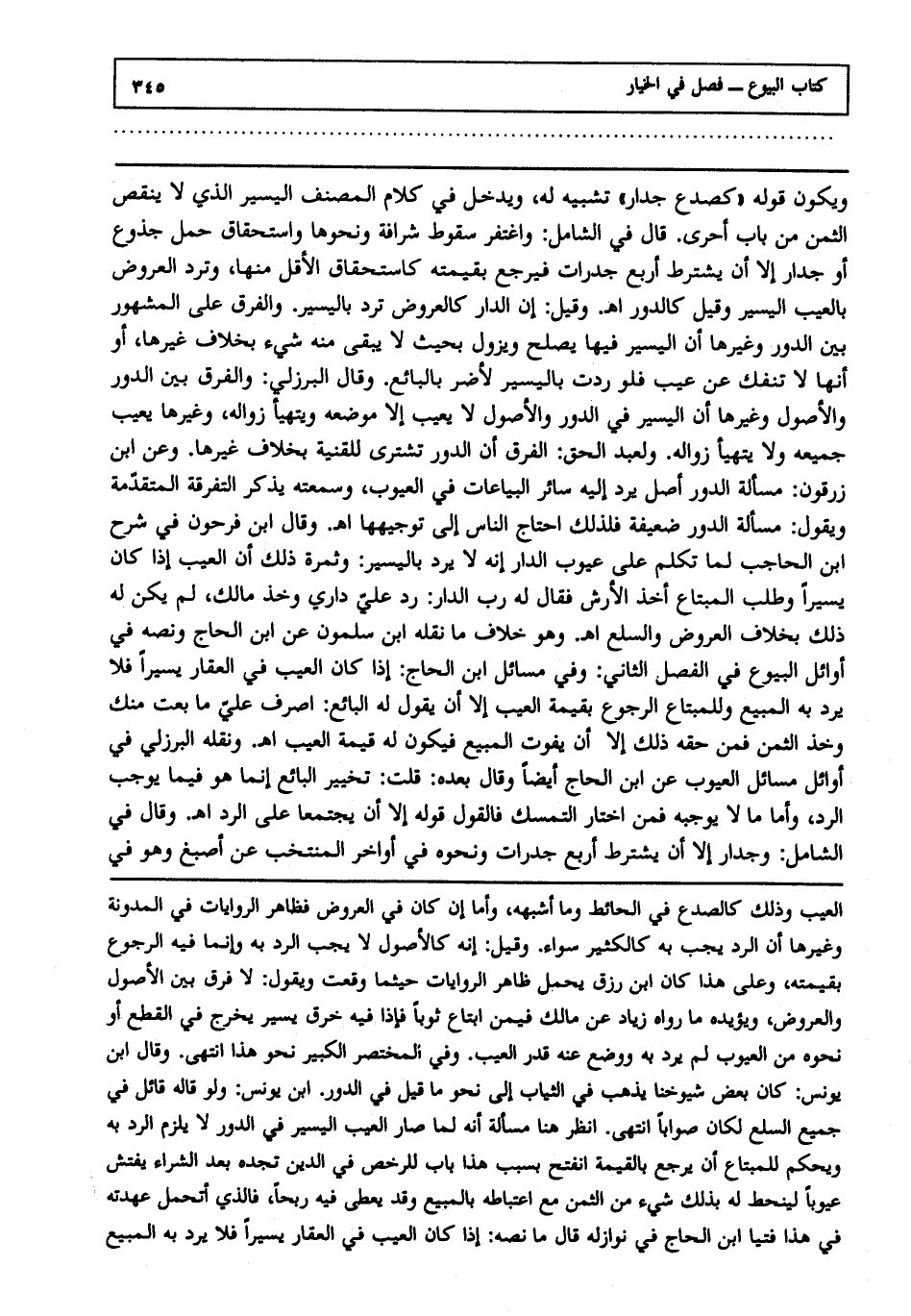 ويكون قوله: "كصدع جدار" تشبيها له ويدخل في كلام المصنف اليسير الذي لا ينقص الثمن من باب أحرى. قال في الشامل: واغتفر سقوط شرفة ونحوها واستحقاق حمل جذوع، أو جدار إلا أن يشترط أربع جدران فيرجع بقيمته كاستحقاق الأقل منها، وترد العروض بالعيب اليسير وقيل كالدور ا هـ. وقيل: إن الدار كالعروض ترد باليسير، والفرق على المشهور بين الدور وغيرها أن اليسير فيها يصلح ويزول بحيث لا يبقى منه شيء بخلاف غيرها، أو أنها لا تنفك عن عيب، فلو ردت باليسير لأضر بالبائع، وقال البرزلي: والفرق بين الدور والأصول وغيرها أن اليسير في الدور والأصول لا يعيب إلا موضعه ويتهيأ زواله، وغيرها يعيب جميعه، ولا يتهيأ زواله ولعبد الحق الفرق أن الدور تشترى للقنية بخلاف غيرها، وعن ابن زرقون مسألة الدور أصل يرد إليه سائر البياعات في العيوب وسمعته يذكر التفرقة المتقدمة، ويقول: مسألة الدور ضعيفة فلذلك احتاج الناس إلى توجيهها ا هـ. وقال ابن فرحون في شرح ابن الحاجب لما تكلم على عيوب الدار: إنه لا يرد باليسير، وثمرة ذلك أن العيب إذا كان يسيرا وطلب المبتاع أخذ الأرش فقال له رب الدار: رد علي داري، وخذ مالك لم يكن له ذلك بخلاف العروض والسلع ا هـ. وهو خلاف ما نقله ابن سلمون عن ابن الحاج، ونصه: في أوائل البيوع في الفصل الثاني، وفي مسائل ابن الحاج إذا كان العيب في العقار يسيرا فلا يرد به المبيع وللمبتاع الرجوع بقيمة العيب إلا أن يقول له البائع: اصرف علي ما بعت منك، وخذ الثمن فمن حقه ذلك إلا أن يفوت المبيع، فيكون له قيمة العيب ا هـ. ونقله البرزلي في أوائل مسائل العيوب عن ابن الحاج أيضا، وقال بعده: قلت تخيير البائع إنما هو فيما يوجب الرد، وأما ما لا يوجبه فمن اختار التمسك فالقول قوله إلا أن يجتمعا على الرد ا هـ. وقال في الشامل: وجدار إلا أن يشترط أربع جدران، ونحوه في أواخر المنتخب عن أصبغ، وهو في