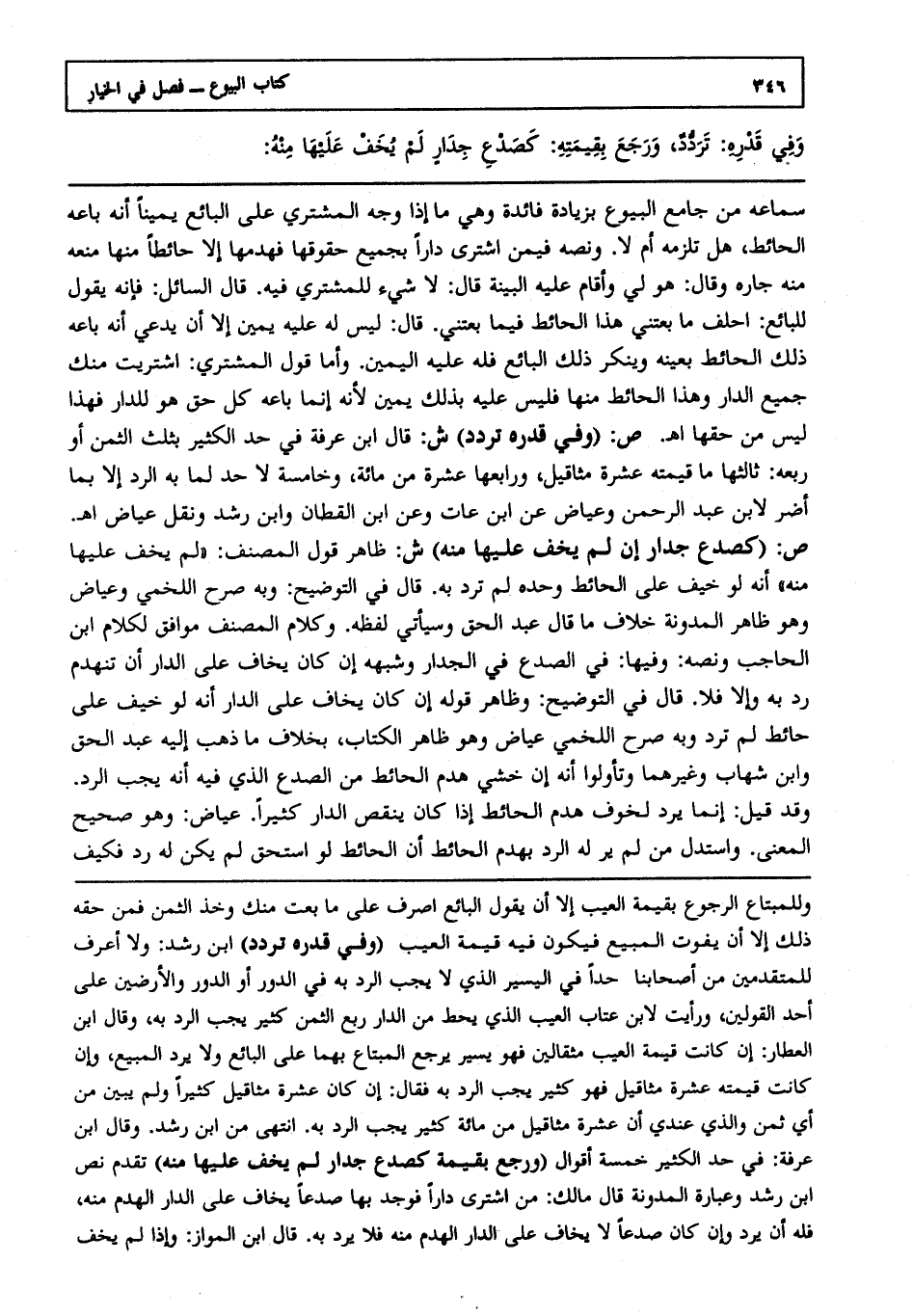 سماعه من جامع البيوع بزيادة فائدة، وهي ما إذا وجه المشتري على البائع يمينا أنه باعه الحائط هل تلزمه أم لا ؟، ونصه: فيمن اشترى دارا بجميع حقوقها فهدمها إلا حائطا منها منعه منه جاره، وقال: هو لي وأقام عليه البينة، قال: لا شيء للمشتري فيه قال السائل فإنه يقول للبائع: احلف ما بعتني هذا الحائط فيما بعتني. قال: ليس له عليه يمين إلا أن يدعي أنه باعه ذلك الحائط بعينه وينكر ذلك البائع فله عليه اليمين. وأما قول المشتري: اشتريت منك جميع الدار، وهذا الحائط منها فليس عليه بذلك يمين؛ لأنه إنما باعه كل حق هو للدار فهذا ليس من حقها ا هـ. ص: (وفي قدره تردد) ش: قال ابن عرفة في حد الكثير بثلث الثمن، أو ربعه ثالثها ما قيمته عشرة مثاقيل ورابعها عشرة من مائة، وخامسها: لا حد لما به الرد إلا بما أضر لابن عبد الرحمن وعياض عن ابن عات وعن ابن القطان وابن رشد، ونقل عياض ا هـ. ص: (كصدع جدران لم يخف عليها منه) ش: ظاهر قول المصنف "لم يخف عليها منه" أنه لو خيف على الحائط وحده لم ترد به. قال في التوضيح: وبه صرح اللخمي وعياض، وهو ظاهر المدونة خلاف ما قال عبد الحق وسيأتي لفظه، وكلام المصنف موافق لكلام ابن الحاجب، ونصه: وفيها في الصدع في الجدار وشبهه إن كان يخاف على الدار أن تنهدم رد به وإلا فلا. قال في التوضيح: وظاهر قوله: إن كان يخاف على الدار أنه لو خيف على حائط لم ترد، وبه صرح اللخمي. عياض، وهو ظاهر الكتاب بخلاف ما ذهب إليه عبد الحق وابن شهاب وغيرهما وتأولوا أنه إن خشي هدم الحائط من الصدع الذي فيه أنه يجب الرد، وقد قيل: إنما يرد لخوف هدم الحائط إذا كان ينقص الدار كثيرا عياض، وهو صحيح المعنى، واستدل من لم ير له الرد بهدم الحائط أن الحائط لو استحق لم يكن له رد فكيف