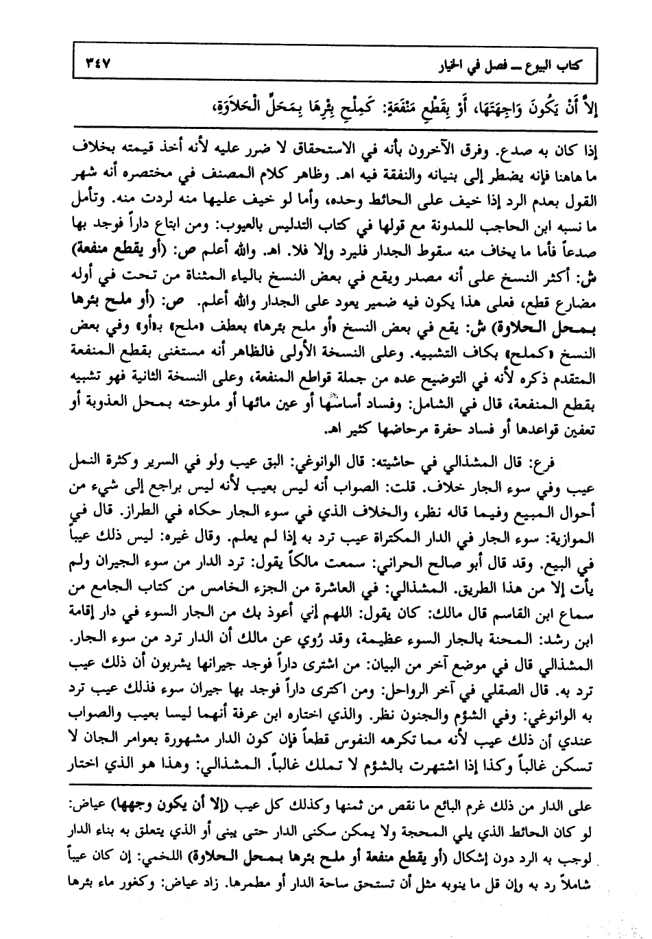 إذا كان به صدع. وفرق الآخرون بأنه في الاستحقاق لا ضرر عليه؛ لأنه أخذ قيمته بخلاف ما هاهنا فإنه يضطر إلى بنيانه والنفقة فيه ا هـ. وظاهر كلام المصنف في مختصره أنه شهر القول بعدم الرد إذا خيف على الحائط وحده، وأما لو خيف عليها منه لردت منه، وتأمل ما نسبه ابن الحاجب للمدونة مع قولها في كتاب التدليس بالعيوب ومن ابتاع دارا فوجد بها صدعا فأما ما يخاف منه سقوط الجدار فليرد، وإلا فلا ا هـ. والله أعلم. ص: (أو بقطع منفعة) ش: أكثر النسخ على أنه مصدر ويقع في بعض النسخ بالياء المثناة من تحت في أوله مضارع قطع فعلى هذا يكون فيه ضمير يعود على الجدار والله أعلم. ص: (أو ملح بئرها بمحل الحلاوة) ش: يقع في بعض النسخ، أو ملح بئرها بعطف ملح بأو، وفي بعض النسخ كملح بكاف التشبيه. وعلى النسخة الأولى فالظاهر أنه مستغنى بقطع المنفعة المتقدم ذكره؛ لأنه في التوضيح عده من جملة قواطع المنفعة وعلى النسخة الثانية فهو تشبيه بقطع المنفعة. قال في الشامل وفساد أساسها، أو عين مائها، أو ملوحته بمحل العذوبة، أو تعفين قواعدها، أو فساد حفرة مرحاضها كثير ا هـ.