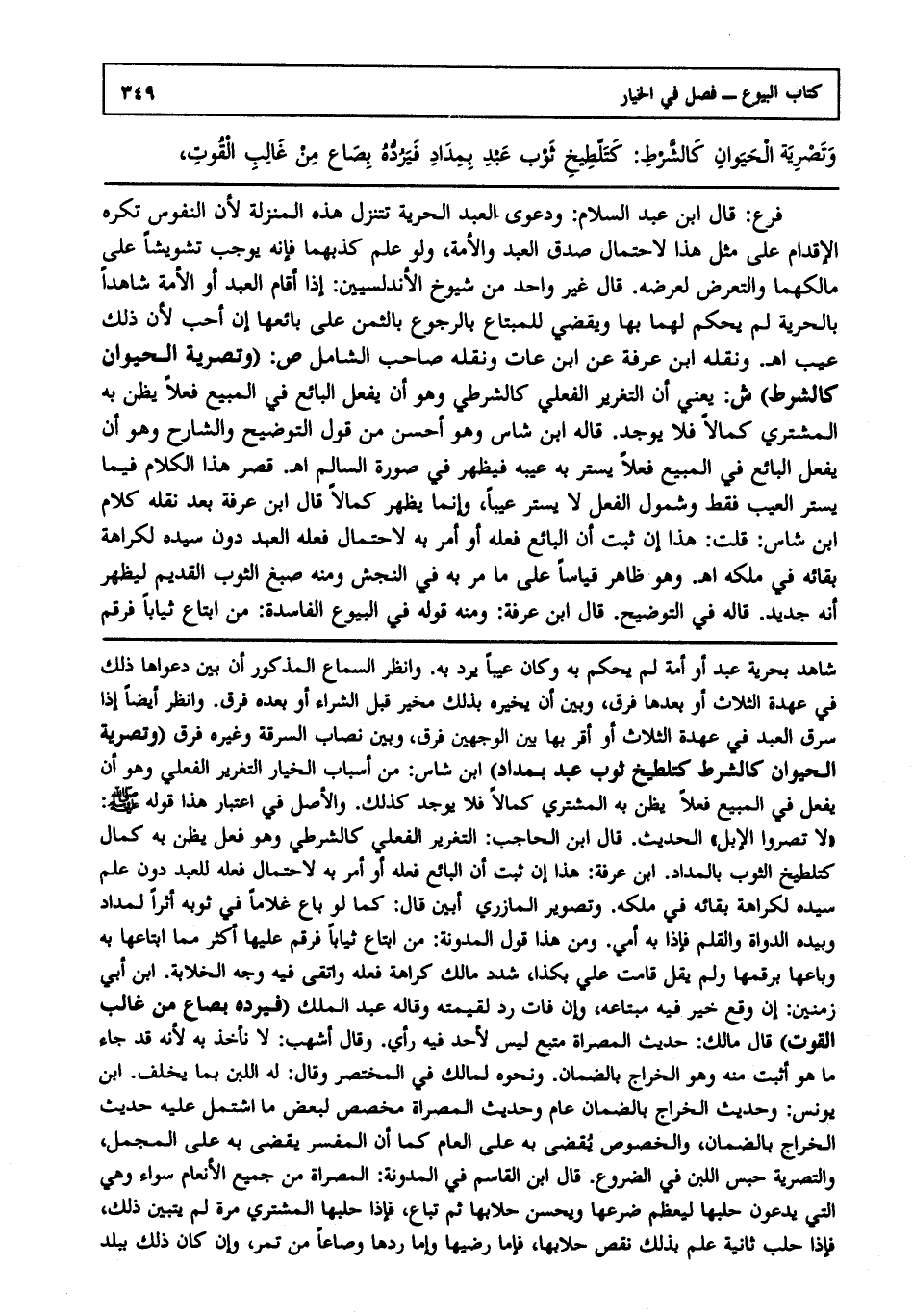 فرع: قال ابن عبد السلام: ودعوى العبد الحرية تتنزل هذه المنزلة؛ لأن النفوس تكره الإقدام على مثل هذا لاحتمال صدق العبد والأمة، ولو علم كذبهما فإنه يوجب تشويشا على مالكها والتعرض لعرضه. قال غير واحد من شيوخ الأندلسيين: إذا أقام العبد، أو الأمة شاهدا بالحرية لم يحكم لهما بها ويقضى للمبتاع بالرجوع بالثمن على بائعهما إن أحب؛ لأن ذلك عيب ا هـ. ونقله ابن عرفة عن ابن عات، ونقله صاحب الشامل.ص: (وتصرية الحيوان كالشرط) ش: يعني أن التغرير الفعلي كالشرطي، وهو أن يفعل البائع في المبيع فعلا يظن به المشتري كمالا فلا يوجد قاله ابن شاس، وهو أحسن من قول التوضيح والشارح، وهو أن يفعل البائع في المبيع فعلا يستر به عيبه فيظهر في صورة السالم ا هـ. قصر هذا الكلام فيما يستر العيب فقط وشمول الفعل لا يستر عيبا، وإنما يظهر كمالا. قال ابن عرفة بعد نقله كلام ابن شاس قلت: هذا إن ثبت أن البائع فعله، أو أمر به لاحتمال فعله العبد دون سيده لكراهة بقائه في ملكه ا هـ. وهو ظاهر قياسا على ما مر به في النجش، ومنه صبغ الثوب القديم ليظهر أنه جديد قاله في التوضيح. قال ابن عرفة: ومنه قوله في البيوع الفاسدة: من ابتاع ثيابا فرقم