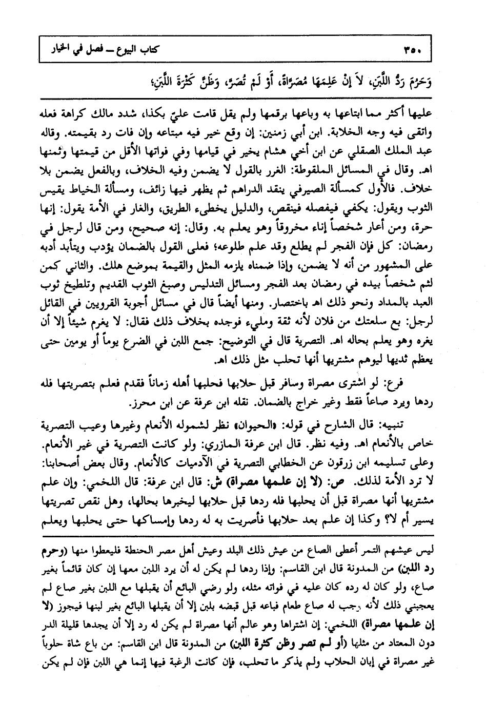 تنبيه: قال الشارح في قوله: الحيوان، نظر؛ لشموله الأنعام وغيرها، وعيب التصرية خاص بالأنعام ا هـ. وفيه نظر. قال ابن عرفة المازري: ولو كانت التصرية في غير الأنعام، وعلى تسليمه ابن زرقون عن الخطابي التصرية في الآدميات كالأنعام، وقال بعض أصحابنا: لا ترد الأمة لذلك ص: (لا إن علمها مصراة) ش: قال ابن عرفة. قال اللخمي: وإن علم مشتريها أنها مصراة قبل أن يحلبها فله ردها قبل حلابها ليخبرها بحالها، وهل نقص تصريتها يسير أم لا ؟، وكذا إن علم بعد حلبها فأصريت به له ردها وإمساكها حتى يحلبها ويعلم