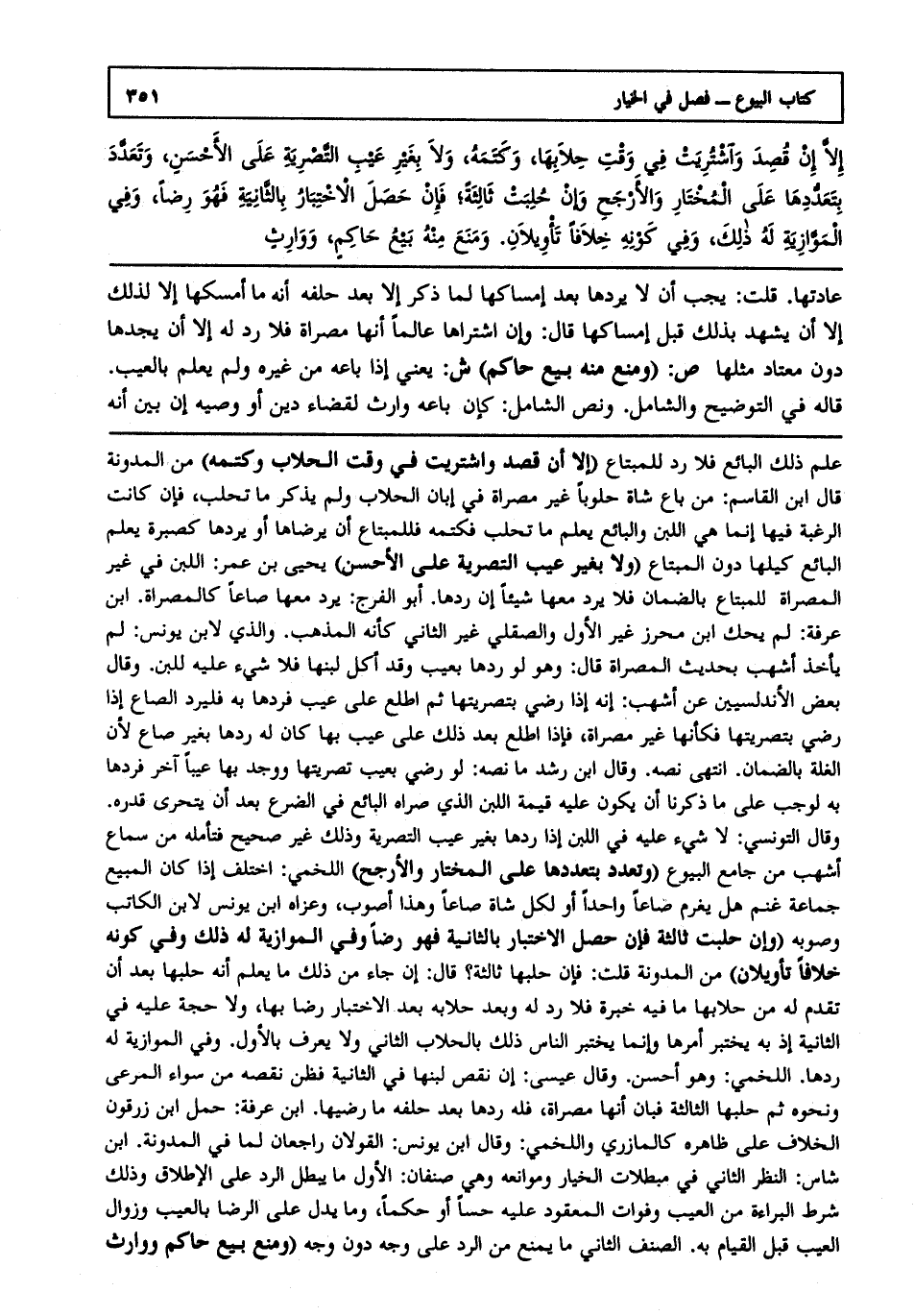 إلا إن قصدت واشتريت في وقت حلابها, وكتمه, ولا بغير عيب التصرية على الأحسن, وتعدد بتعددها على المختار والأرجح وإن حلبت ثالثة؛ فإن حصا الاختيار بالثانية فهو رضا, وفي الموازية له ذلك, وفي كونه خلافا تأويلان. ومنع منه بيع حاكم, ووارث