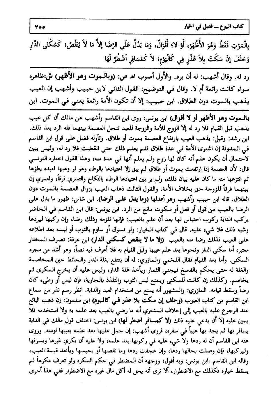 رد له. وقال أشهب: له أن يرد. والأول: أصوب ا هـ. ص: (وبالموت، وهو الأظهر) ش: ظاهر سواء كانت رائعة أم لا ؟. وقال في التوضيح: القول الثاني لابن حبيب وأشهب إن العيب يذهب بالموت دون الطلاق ابن حبيب إلا أن تكون الأمة رائعة يعني في الموت ابن