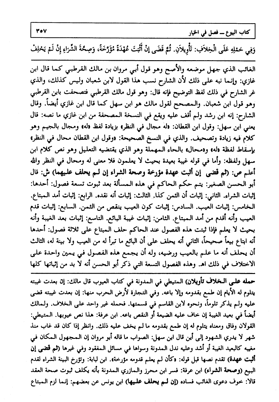 الغائب الذي جهل موضعه والأصح هو قول أبي مروان بن مالك القرطبي كما. قال ابن غازي، وإنما نبه على ذلك؛ لأن الشارح نسب هذا القول لابن شعبان، وليس كذلك، والذي غر الشارح في ذلك لفظ التوضيح فإنه قال: وهو قول ابن مالك القرطبي فتصحفت ابن القرطبي، وهو قول ابن شعبان والمصحح لقول مالك هو ابن سهل كما قال ابن غازي أيضا. وقال الشارح: إنه ابن رشد، ولم أقف عليه ويقع في النسخة المصحفة من ابن غازي ما نصه قال يعني ابن سهل: وقول ابن القطان "له مجال في النظر" بزيادة لفظ "له"، ومجال بالجيم، وهو كلام فيه زيادة وتصحيف والذي في النسخ الصحيحة: وقول ابن القطان: محال في النظر، بإسقاط لفظة "له" و"محال" بالحاء المهملة، وهو الذي يقتضيه التعليل، وهو نص كلام ابن سهل ولفظه: وأما في قوله غيبة بعيدة بحيث لا يعلمون فلا معنى له، ومحال في النظر والله أعلم. ص: (ثم قضى إن أثبت عهدة مؤرخة وصحة الشراء إن لم يحلف عليهما) ش: قال أبو الحسن الصغير يتم حكم الحاكم في هذه المسألة بعد ثبوت تسعة فصول: أحدها إثبات الشراء. الثاني: إثبات أن الثمن كذا. الثالث إثبات أنه نقده. الرابع إثبات أمد المبتاع. الخامس إثبات العيب. السادس: إثبات كون العيب ينقص من الثمن. السابع: إثبات قدم العيب، وأنه أقدم من أمد المبتاع. الثامن: إثبات غيبة البائع. التاسع: إثبات بعد الغيبة وأنه بحيث لا يعلم فإذا ثبتت هذه الفصول عند الحاكم حلف المبتاع على ثلاثة فصول: أحدها: أنه ابتاع بيعا صحيحا. الثاني: أنه يحلف أن البائع ما تبرأ له من العيب، ولا بينه له. الثالث: أن يحلف أنه ما علم بالعيب، ورضيه، وله أن يجمع هذه الفصول في يمين واحدة على الاختلاف في ذلك ا هـ. وهذه الفصول التسعة التي ذكر أبو الحسن أنه لا بد من إثباتها كلها