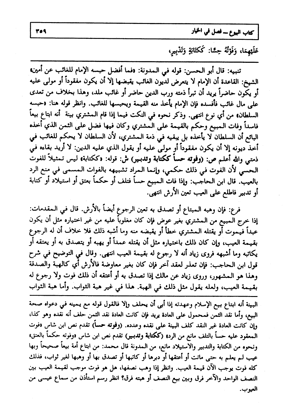 تنبيه: قال أبو الحسن: قوله في المدونة: "فما فضل حبسه الإمام للغائب عند أمين" الشيخ. القاعدة: أن الإمام لا يتعرض لديون الغائب يقبضها إلا أن يكون مفقودا، أو مولى عليه، أو يكون حاضرا يريد أن تبرأ ذمته، ورب الدين حاضر، أو غائب ملد، وهذا بخلاف من تعدى على مال غائب فأفسده فإن الإمام يأخذ منه القيمة ويحبسها للغائب. وانظر قوله هنا: حبسه السلطان من أي نوع ؟ انتهى.، وذكر نحوه في النكت فيما إذا أقام المشتري بينة أنه ابتاع بيعا فاسدا، أو فات المبيع، وحكم بالقيمة على المشتري، وكان فيها فضل على الثمن الذي أخذه البائع أن السلطان لا يأخذه بل يبقيه في ذمة المشتري؛ لأن السلطان لا يحكم للغائب في أخذ ديونه إلا أن يكون مفقودا، أو مولى عليه، أو يقول الذي عليه الدين لا أريد بقاءه في ذمتي، والله أعلم.ص: (وفوته حسا ككتابة وتدبير) ش قوله: ككتابة ليس تمثيلا للفوت الحسي؛ لأن الفوت في ذلك حكمي، وإنما المراد تشبيهه بالفوت المسمى في منع الرد بالعيب. قال ابن الحاجب: وإذا فات المبيع حسا فتلف، أو حكما بعتق، أو استيلاد، أو كتابة، أو تدبير فاطلع على العيب تعين الأرش انتهى.