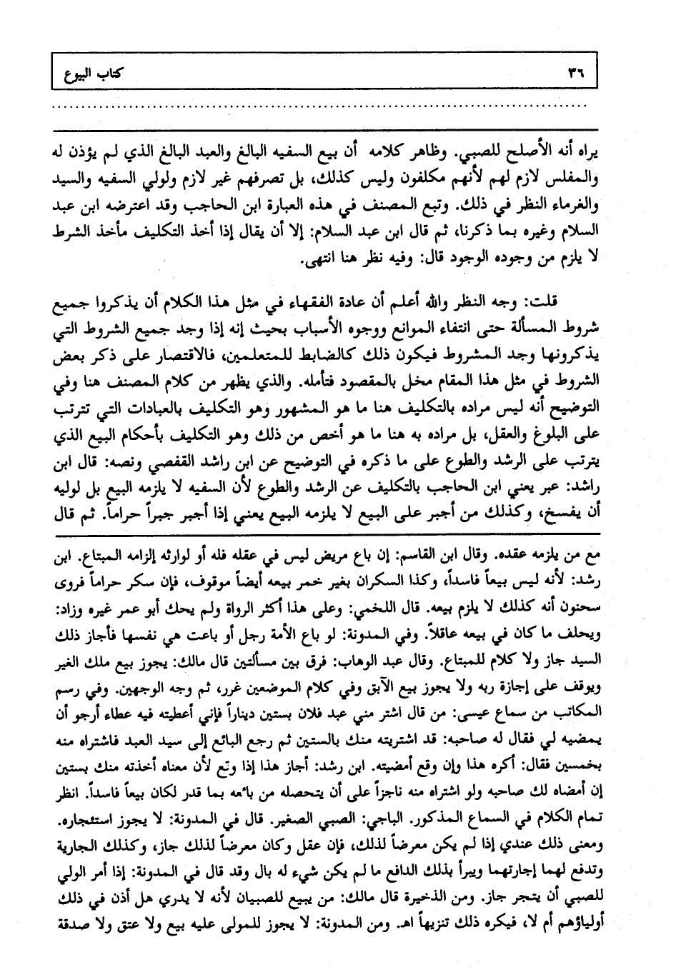 يراه أنه الأصلح للصبي وظاهر كلامه أن بيع السفيه البالغ، والعبد البالغ الذي لم يؤذن له، والمفلس لازم لهم؛ لأنهم مكلفون، وليس كذلك بل تصرفهم غير لازم، ولولي السفيه والسيد، والغرماء النظر في ذلك وتبع المصنف في هذه العبارة ابن الحاجب. وقد اعترضه ابن عبد السلام وغيره بما ذكرنا، ثم قال ابن عبد السلام: إلا أن يقال إذا أخذ التكليف مأخذ الشرط لا يلزم من وجوده الوجود قال: وفيه نظر هنا انتهى.