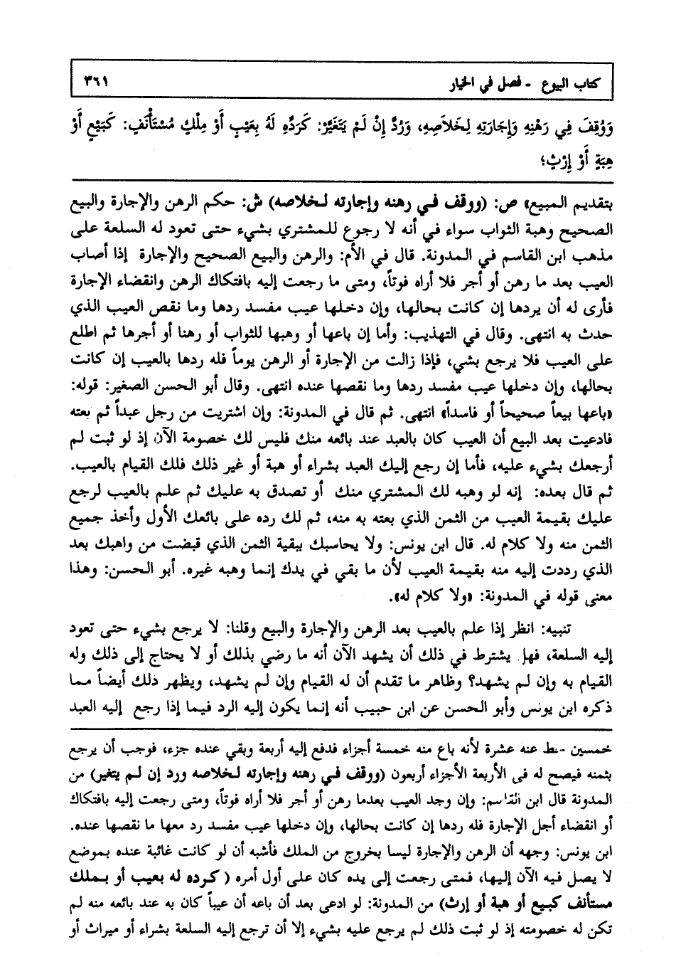 بتقديم المبيع".ص: (ووقف في رهنه وإجارته لخلاصه) ش حكم الرهن والإجارة والبيع الصحيح وهبة الثواب سواء في أنه لا رجوع للمشتري بشيء حتى تعود له السلعة على مذهب ابن القاسم في المدونة قال في الأم: والرهن والبيع الصحيح والإجارة إذا أصاب العيب بعد ما رهن، أو أجر فلا أراه فوتا ومتى ما رجعت إليه بافتكاك الرهن وانقضاء الإجارة فأرى له أن يردها إن كانت بحالها، وإن دخلها عيب مفسد ردها، وما نقص العيب الذي حدث به انتهى. وقال في التهذيب: وأما إن باعها، أو وهبها للثواب، أو رهنها، أو أجرها، ثم اطلع على العيب فلا يرجع بشيء فإذا زالت من الإجارة، أو الرهن يوما فله ردها بالعيب إن كانت بحالها، وإن دخلها عيب مفسد ردها وما نقصها عنده انتهى. وقال أبو الحسن الصغير: قوله: باعها بيعا صحيحا، أو فاسدا انتهى. ثم قال في المدونة: وإن اشتريت من رجل عبدا، ثم بعته فادعيت بعد البيع أن العيب كان بالعبد عند بائعه منك فليس لك خصومة الآن؛ إذ لو ثبت لم أرجعك بشيء عليه فأما إن رجع إليك العبد بشراء، أو هبة، أو غير ذلك فلك القيام بالعيب، ثم قال بعده: إنه لو وهبه لك المشتري منك، أو تصدق به عليك، ثم علم بالعيب لرجع عليك بقيمة العيب من الثمن الذي بعته به منه، ثم لك رده على بائعك الأول، وأخذ جميع الثمن منه، ولا كلام له. قال ابن يونس: ولا يحاسبك ببقية الثمن الذي قبضت من واهبك بعد الذي رددت إليه منه بقيمة العيب؛ لأن ما بقي في يدك إنما وهبه غيره أبو الحسن وهذا معنى قوله في المدونة: "ولا كلام له".