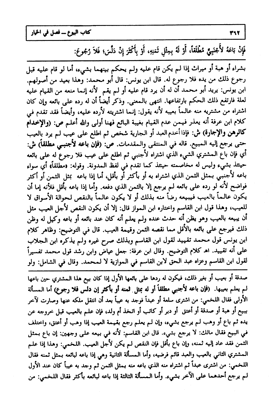 بشراء، أو هبة، أو ميراث إذا لم يكن قام عليه، ولم يحكم بينهما بشيء أما لو قام عليه قبل رجوع ذلك من يده فلا رجوع له. قال ابن يونس: قال أبو محمد: وهذا بعيد من أصولهم ابن يونس يريد أبو محمد أن له أن يرد قام عليه، أو لم يقم؛ لأنه إنما منعه من القيام عليه لعلة فارتفع ذلك الحكم بارتفاعها انتهى بالمعنى. وذكر أيضا أن له رده على بائعه، وإن كان اشتراه من مشتريه منه عالما بعيبه؛ لأنه يقول: إنما اشتريته لأرده عليه، وأيضا فقد تقدم في كلام ابن عرفة أنه يعذر فيمن عدم القيام بغيبة البائع فهنا أولى، والله أعلم.ص: (والإخدام كالرهن والإجارة) ش: فإذا أخدم العبد، أو الجارية شخص، ثم اطلع على عيب لم يرد بالعيب حتى يرجع إليه المبيع قاله في المنتقى والمقدمات ص: (فإن باعه لأجنبي مطلقا) ش: أي، فإن باع المشتري الشيء الذي اشتراه لأجنبي، ثم اطلع على عيب فلا رجوع له على بائعه حينئذ بشيء، وليس له مخاصمته حينئذ كما تقدم في لفظ المدونة وقوله مطلقا أي سواء باعه لأجنبي بمثل الثمن الذي اشتراه به، أو بأكثر، أو بأقل أما إذا باعه بمثل الثمن، أو أكثر فواضح؛ لأنه لو رده على بائعه لم يرجع إلا بالثمن الذي دفعه، وأما إذا باعه بأقل فلأنه إما أن يكون عالما بالعيب فيبيعه رضا منه بذلك، أو لا يكون عالما بالنقص لحوالة الأسواق لا للعيب، وهذا قول ابن القاسم واختاره ابن المواز. قال إلا أن يكون النقص لأجل العيب، مثل أن يبيعه بالعيب، وهو يظن أنه حدث عنده. ولم يعلم أنه كان عند بائعه، أو باعه وكيل له، وظن ذلك فيرجع على بائعه بالأقل مما نقصه الثمن وقيمة العيب. قال في التوضيح: وظاهر كلام ابن يونس قول محمد تقييد لقول ابن القاسم وبذلك صرح غيره، ولم يذكره ابن الجلاب على أنه تقييد ا هـ. كلام التوضيح، وقال ابن عرفة جعل عياض وابن رشد قول محمد تفسيرا لقول ابن القاسم وعزاه عبد الحق لابن القاسم في الموازية لا لمحمد وقال في الشامل: ولو