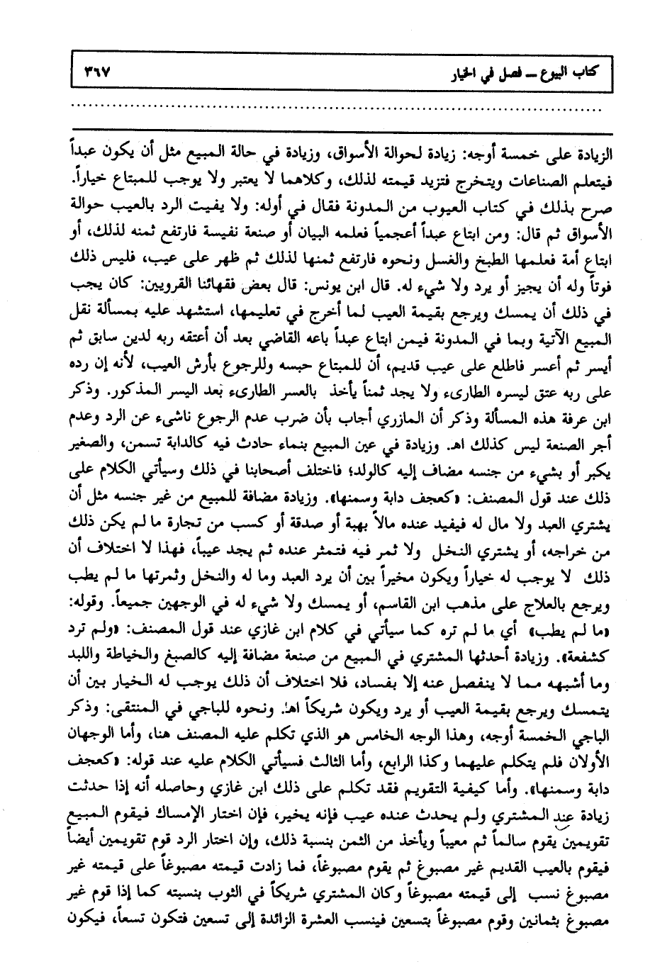 الزيادة على خمسة، أوجه: زيادة لحوالة الأسواق وزيادة في حالة المبيع مثل أن يكون عبدا فيتعلم الصناعات، ويتخرج فتزيد قيمته لذلك، وكلاهما لا يعتبر، ولا يوجب للمبتاع خيارا صرح بذلك في كتاب العيوب من المدونة فقال في أوله: ولا يفيت الرد بالعيب حوالة الأسواق، ثم قال: ومن ابتاع عبدا أعجميا فعلمه البيان، أو صنعة نفيسة فارتفع ثمنه لذلك، أو ابتاع أمة فعلمها الطبخ والغسل ونحوه فارتفع ثمنها لذلك، ثم ظهر على عيب فليس ذلك فوتا، وله أن يجيز، أو يرد، ولا شيء له. قال ابن يونس: قال بعض فقهائنا القرويين: كان يجب في ذلك أن يمسك ويرجع بقيمة العيب لما أخرج في تعليمها. استشهد عليه بمسألة نقل المبيع الآتية، وبما في المدونة فيمن ابتاع عبدا باعه القاضي بعد أن أعتقه ربه لدين سابق، ثم أيسر، ثم أعسر فاطلع على عيب قديم أن للمبتاع حبسه والرجوع بأرش العيب؛ لأنه إن رده على ربه عتق ليسره الطارئ، ولا يجد ثمنا يأخذ بالعسر الطارئ بعد اليسر المذكور، وذكر ابن عرفة هذه المسألة، وذكر أن المازري أجاب بأن ضرب عدم الرجوع ناشئ عن الرد وعدم أجر الصنعة ليس كذلك ا هـ. وزيادة في عين المبيع بنماء حادث فيه كالدابة تسمن والصغير يكبر، أو بشيء من جنسة مضاف إليه كالولد فاختلف أصحابنا في ذلك، وسيأتي الكلام على ذلك عند قول المصنف كعجف دابة وسمنها، وزيادة مضافة للمبيع من غير جنسه مثل أن يشتري العبد، ولا مال له فيفيد عنده مالا بهبة أو صدقة، أو كسب من تجارة ما لم يكن ذلك من خراجه، أو يشتري النخل، ولا ثمر فيه فتثمر عنده، ثم يجد عيبا فهذا لا اختلاف أن ذلك لا يوجب له خيارا، أو يكون مخيرا بين أن يرد العبد وماله والنخل وثمرتها ما لم يطب، ويرجع بالعلاج على مذهب ابن القاسم، أو يمسك، ولا شيء له في الوجهين جميعا. وقوله: ما لم يطب أي ما لم تزه كما سيأتي في كلام ابن غازي عند قول المصنف: ولم ترد كشفعة وزيادة أحدثها المشتري في المبيع من صنعة مضافة إليه كالصبغ والخياطة واللبد، وما أشبهه مما لا ينفصل عنه إلا بفساد، فلا اختلاف أن ذلك يوجب له الخيار بين أن يتمسك ويرجع بقيمة العيب، أو يرد، ويكون شريكا ا هـ. ونحوه للباجي في المنتقى، وذكر الباجي الخمسة أوجه، وهذا الوجه الخامس هو الذي تكلم عليه المصنف هنا، وأما الوجهان الأولان، فلم يتكلم عليهما، وكذا الرابع، وأما الثالث فسيأتي الكلام عليه عند قوله: كعجف دابة وسمنها، وأما كيفية التقويم، فقد تكلم على ذلك ابن غازي وحاصله: أنه إذا حدثت زيادة عند المشتري، ولم يحدث عنده عيب فإنه يخير، فإن اختار الإمساك فيقوم المبيع تقويمين يقوم سالما، ثم معيبا، ويأخذ من الثمن بنسبة ذلك، وإن اختار الرد قوم تقويمين أيضا فيقوم بالعيب القديم غير مصبوغ. ثم يقوم مصبوغا فما زادت قيمته مصبوغا على قيمته غير مصبوغ نسب إلى قيمته مصبوغا وكان المشتري شريكا في الثواب بنسبته كما إذا قوم غير مصبوغ بثمانين وقوم مصبوغا بتسعين فينسب العشرة الزائدة إلى تسعين فتكون تسعا، فيكون