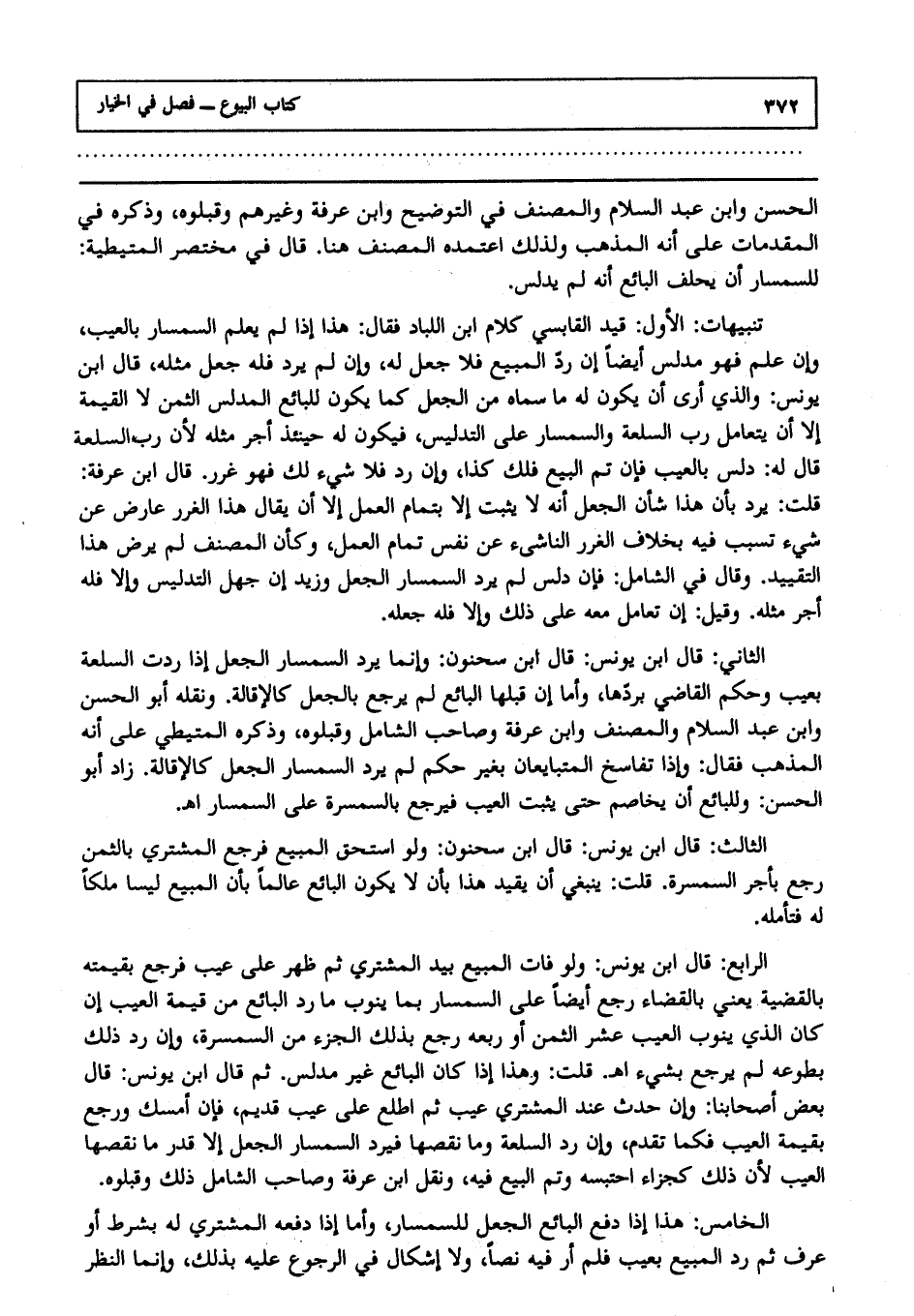 الثاني: قال ابن يونس: قال ابن سحنون: وإنما يرد السمسار الجعل إذا ردت السلعة بعيب، وحكم القاضي بردها، وأما إن قبلها البائع لم يرجع بالجعل كالإقالة، ونقله أبو الحسن وابن عبد السلام والمصنف وابن عرفة وصاحب الشامل وقبلوه، وذكره المتيطي على أنه المذهب فقال وإذا تفاسخ المتبايعان بغير حكم لم يرد السمسار الجعل كالإقالة زاد أبو الحسن وللبائع أن يخاصم حتى يثبت العيب فيرجع بالسمسرة على السمسار ا هـ.