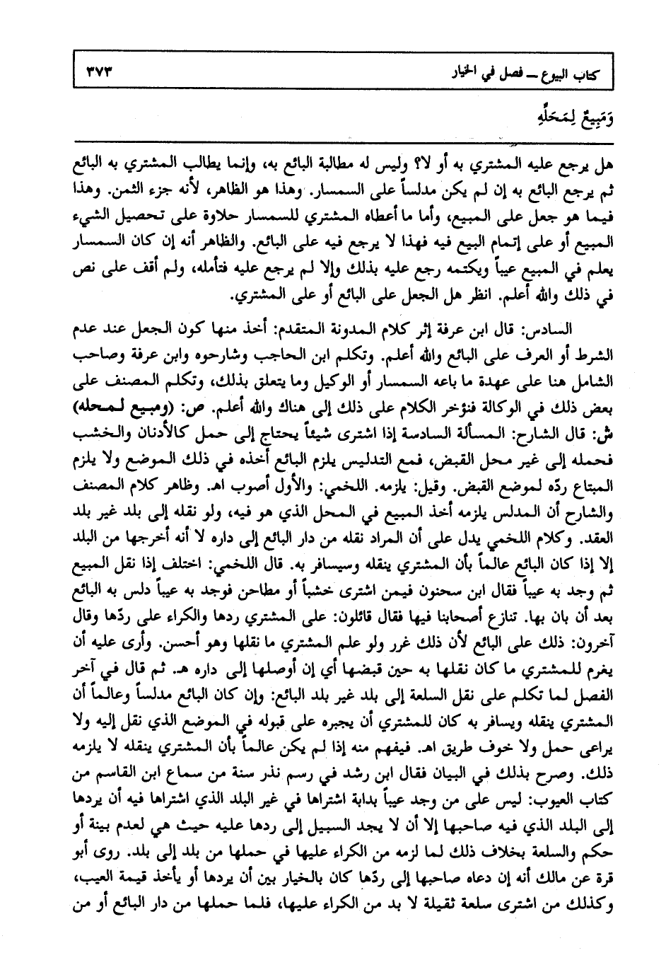هل يرجع عليه المشتري به، أو لا ؟، وليس له مطالبة البائع به، وإنما يطالب المشتري به البائع، ثم يرجع البائع به إن لم يكن مدلسا على السمسار، وهذا هو الظاهر؛ لأنه جزء الثمن، وهذا فيما هو جعل على المبيع، وأما ما أعطاه المشتري للسمسار حلاوة على تحصيل الشيء المبيع، أو على إتمام البيع فيه فهذا لا يرجع فيه على البائع والظاهر: أنه إن كان السمسار يعلم في المبيع عيبا ويكتمه رجع عليه بذلك، وإلا لم يرجع عليه فتأمله. ولم أقف على نص في ذلك والله أعلم. انظر هل الجعل على البائع، أو على المشتري. السادس: قال ابن عرفة إثر كلام المدونة المتقدم: أخذ منها كون الجعل عند عدم الشرط، أو العرف على البائع والله أعلم. وتكلم ابن الحاجب وشارحوه وابن عرفة وصاحب الشامل هنا على عهدة ما باعه السمسار، أو الوكيل وما يتعلق بذلك وتكلم المصنف على بعض ذلك في الوكالة فنؤخر الكلام على ذلك إلى هناك، والله أعلم.ص: (ومبيع لمحله) ش: قال الشارح: المسألة السادسة: إذا اشترى شيئا يحتاج إلى حمل كالأدنان والخشب فحمله إلى غير محل القبض فمع التدليس يلزم البائع أخذه في ذلك الموضع، ولا يلزم المبتاع رده لموضع القبض، وقيل يلزمه اللخمي والأول: أصوب ا هـ. وظاهر كلام المصنف والشارح أن المدلس يلزمه أخذ المبيع في المحل الذي هو فيه، ولو نقله إلى بلد غير بلد العقد، وكلام اللخمي يدل على أن المراد نقله من دار البائع إلى داره لا أنه أخرجها من البلد إلا إذا كان البائع عالما بأن المشتري ينقله وسيسافر به. قال اللخمي: اختلف إذا نقل المبيع، ثم وجد به عيبا فقال ابن سحنون فيمن اشترى خشبا، أو مطاحن فوجد به عيبا دلس به البائع بعد أن بان بها: تنازع أصحابنا فيها فقال قائلون على المشتري ردها والكراء على ردها وقال آخرون: ذلك على البائع؛ لأن ذلك غرر، ولو علم المشتري ما نقلها، وهو أحسن وأرى عليه أن يغرم للمشتري ما كان نقلها به حين قبضها أي، إن أوصلها إلى داره ا هـ. ثم قال في آخر الفصل: لما تكلم على نقل السلعة إلى بلد غير بلد البائع، وإن كان البائع مدلسا وعالما أن المشتري ينقله ويسافر به كان للمشتري أن يجبره على قبوله في الموضع الذي نقل إليه، ولا يراعى حمل، ولا خوف طريق ا هـ. فيفهم منه إذا لم يكن عالما بأن المشتري ينقله لا يلزمه ذلك، وصرح بذلك في البيان فقال ابن رشد في رسم نذر سنة من سماع ابن القاسم من كتاب العيوب: ليس على من وجد عيبا بدابة اشتراها في غير البلد الذي اشتراها فيه أن يردها إلى البلد الذي فيه صاحبها إلا أن لا يجد السبيل إلى ردها عليه حيث هي لعدم بينة، أو حكم، والسلعة بخلاف ذلك لما لزمه من الكراء عليها في حملها من بلد إلى بلد روى أبو قرة عن مالك أنه إن دعاه صاحبها إلى ردها كان بالخيار بين أن يردها، أو يأخذ قيمة العيب، وكذلك من اشترى سلعة ثقيلة لا بد من الكراء عليها فلما حملها من دار البائع، أو من