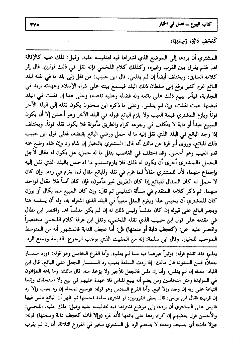 المشتري أن يردها إلى الموضع الذي اشتراها فيه لتدليسه عليه، وقيل: ذلك عليه كالإقالة ا هـ. فلم يفرق بين القرب وغيره، وكذلك كلام اللخمي فإنه نقل في ذلك قولين قال إثر كلامه السابق: ويختلف أيضا إن لم يدلس قال ابن حبيب: من نقل إلى بلد ما في نقله لبلد البائع غرم كثير يرفع إلى سلطان ذلك البلد فيسمع بينته على شراء الإسلام وعهدته يريد في الجارية فيأمر ببيع ذلك على بائعه، وله فضله، وعليه نقصه، وعلى هذا إن نقلت في البلد قبضها حيث نقلت، وإن لم يدلس، وعلى ما ذكره ابن سحنون يكون نقله إلى بلد الآخر فوتا، ويلزم المشتري قيمة العيب، ولا يلزم البائع قبوله في البلد الآخر، وهو أحسن إلا أن يكون المبيع عبدا، أو دابة لا يتكلف في رجوعه كراء والطريق مأمونة فلا يكون نقله فوتا، ويختلف إذا وجد البائع في البلد الذي نقل إليه ماله حمل ورضي البائع بقبضه فعلى قول ابن حبيب ذلك للبائع، وروى أبو قرة عن مالك أنه قال: المشتري بالخيار إن شاء رد، وإن شاء وضع عنه قدر العيب، وهو أحسن. وقد اختلف في الغاصب ينقل ماله حملا هل يكون له مقال لأجل الحمل فالمشتري أحرى أن يكون له ذلك فلا يلزم تسليم ماله حمل بالبلد الذي نقل إليه بإجماع منهما؛ لأن للمشتري مقالا لما غرم في نقله وللبائع مقال لما يغرم في رده، وإن كان لا حمل له كان المقال للبائع إذا كان الطريق غير مأمون، فإن كان آمنا فلا مقال لواحد منهما، ثم ذكر كلامه المتقدم في مسألة التدليس، ثم قال: وإن كان المبيع مما يكال، أو يوزن كان للمشتري أن يحبس هذا، ويغرم المثل معيبا في البلد الذي اشتراه به، وله أن يسلمه هنا، ويجبر البائع على قبوله إن كان مدلسا، وليس ذلك له إن لم يكن مدلسا ا هـ. واقتصر ابن بطال في مقنعه على قول ابن حبيب الذي نقله اللخمي، ونقل ابن عرفة كلام اللخمي مختصرا، واقتصر عليه.ص: (كعجف دابة، أو سمنها) ش: أما عجف الدابة فالمشهور أنه من المتوسط الموجب للخيار وقال ابن سلمة: إنه من المفيت الذي يوجب الرجوع بالقيمة، ويمنع الرد.