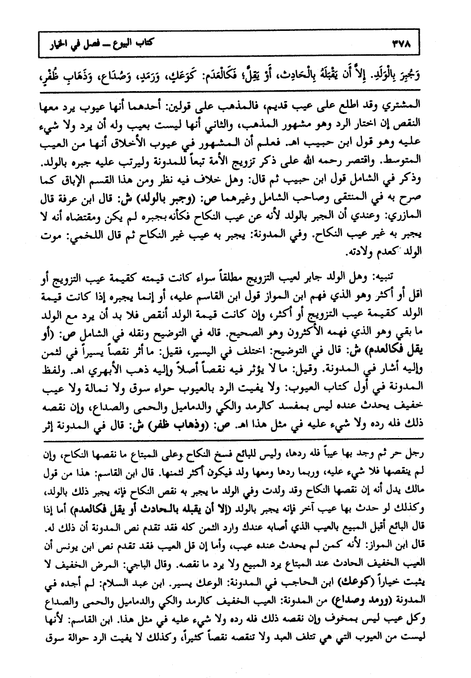 المشتري، وقد اطلع على عيب قديم فالمذهب على قولين: أحدهما: أنها عيوب يرد معها النقص إن اختار الرد، وهو مشهور المذهب. والثاني: أنها ليست بعيب، وله أن يرد، ولا شيء عليه، وهو قول ابن حبيب ا هـ. فعلم أن المشهور في عيوب الأخلاق أنها من العيب المتوسط واقتصر - رحمه الله - على ذكر تزويج الأمة تبعا للمدونة وليرتب عليه جبره بالولد، وذكر في الشامل قول ابن حبيب، ثم قال: وهو خلاف فيه نظر، ومن هذا القسم الإباق كما صرح به في المنتقى وصاحب الشامل وغيرهما ص: (وجبر بالولد) ش: قال ابن عرفة قال المازري: وعندي أن الجبر بالولد؛ لأنه عن عيب النكاح فكأنه بجبره لم يكن، ومقتضاه أنه لا يجبر به غير عيب النكاح، وفي المدونة يجبر به عيب غير النكاح، ثم قال اللخمي: موت الولد كعدم ولادته.