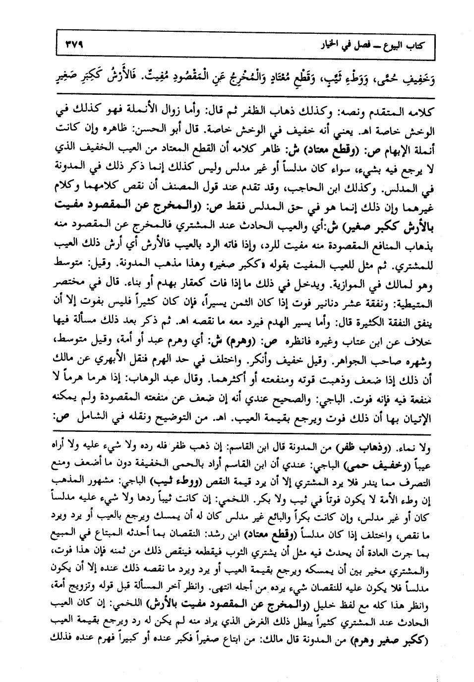 كلامه المتقدم، ونصه: وكذلك ذهاب الظفر، ثم قال: وأما زوال الأنملة فهو كذلك في الوخش خاصة ا هـ. يعني أنه خفيف في الوخش خاصة. قال أبو الحسن: ظاهره، وإن كانت أنملة الإبهام.ص: (وقطع معتاد) ش: ظاهر كلامه أن القطع المعتاد من العيب الخفيف الذي لا يرجع فيه بشيء سواء كان مدلسا، أو غير مدلس، وليس كذلك إنما ذكر ذلك في المدونة في المدلس، وكذلك ابن الحاجب، وقد تقدم عند قول المصنف إن نقص كلامهما، وكلام غيرهما، وأن ذلك إنما هو في حق المدلس فقط.ص: (والمخرج عن المقصود مفيت بالأرش ككبر صغير) ش: أي والعيب الحادث عند المشتري فالمخرج عن المقصود منه بذهاب المنافع المقصودة منه مفيت للرد، وإذا فاته الرد بالعيب فالأرش أي أرش ذلك العيب للمشتري، ثم مثل للعيب المفيت بقوله: ككبر صغير، وهذا مذهب المدونة وقيل متوسط، وهو لمالك في الموازية ويدخل في ذلك ما إذا فات كعقار بهدم، أو بناء. قال في مختصر المتيطية: ونفقة عشر دنانير فوت إذا كان الثمن يسيرا، فإن كان كثيرا فليس بفوت إلا أن ينفق النفقة الكثيرة قال: وأما يسير الهدم فيرد معه ما نقصه ا هـ. ثم ذكر بعد ذلك مسألة فيها خلاف عن ابن عتاب وغيره فانظره.ص: (وهرم) ش: أي وهرم عبد، أو أمة، وقيل متوسط وشهره صاحب الجواهر وقيل خفيف وأنكر واختلف في حد الهرم فنقل الأبهري عن مالك أن ذلك إذا ضعف وذهبت قوته ومنفعته، أو أكثرهما، وقال عبد الوهاب: إذا هرما هرما لا منفعة فيه فإنه فوت الباجي: والصحيح عندي أنه إن ضعف عن منفعته المقصودة، ولم يمكنه الإتيان بها أن ذلك فوت، ويرجع بقيمة العيب ا هـ. من التوضيح، ونقله في الشامل ص: