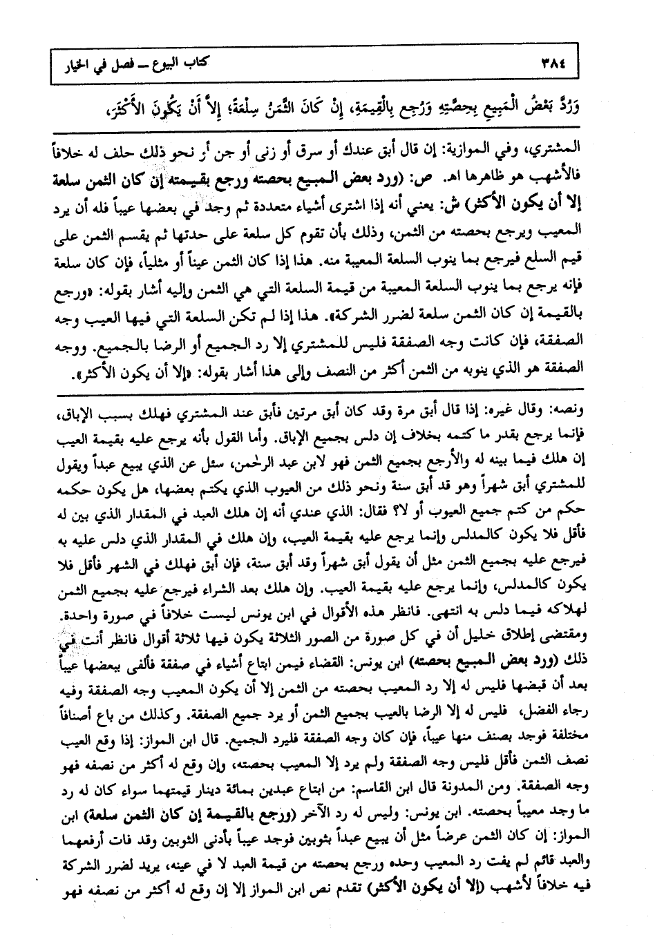 ورد بعض المبيع بحصته ورجع بالقيمة, إن كان الثمن سلعة, إلا أن يكون الأكثر,