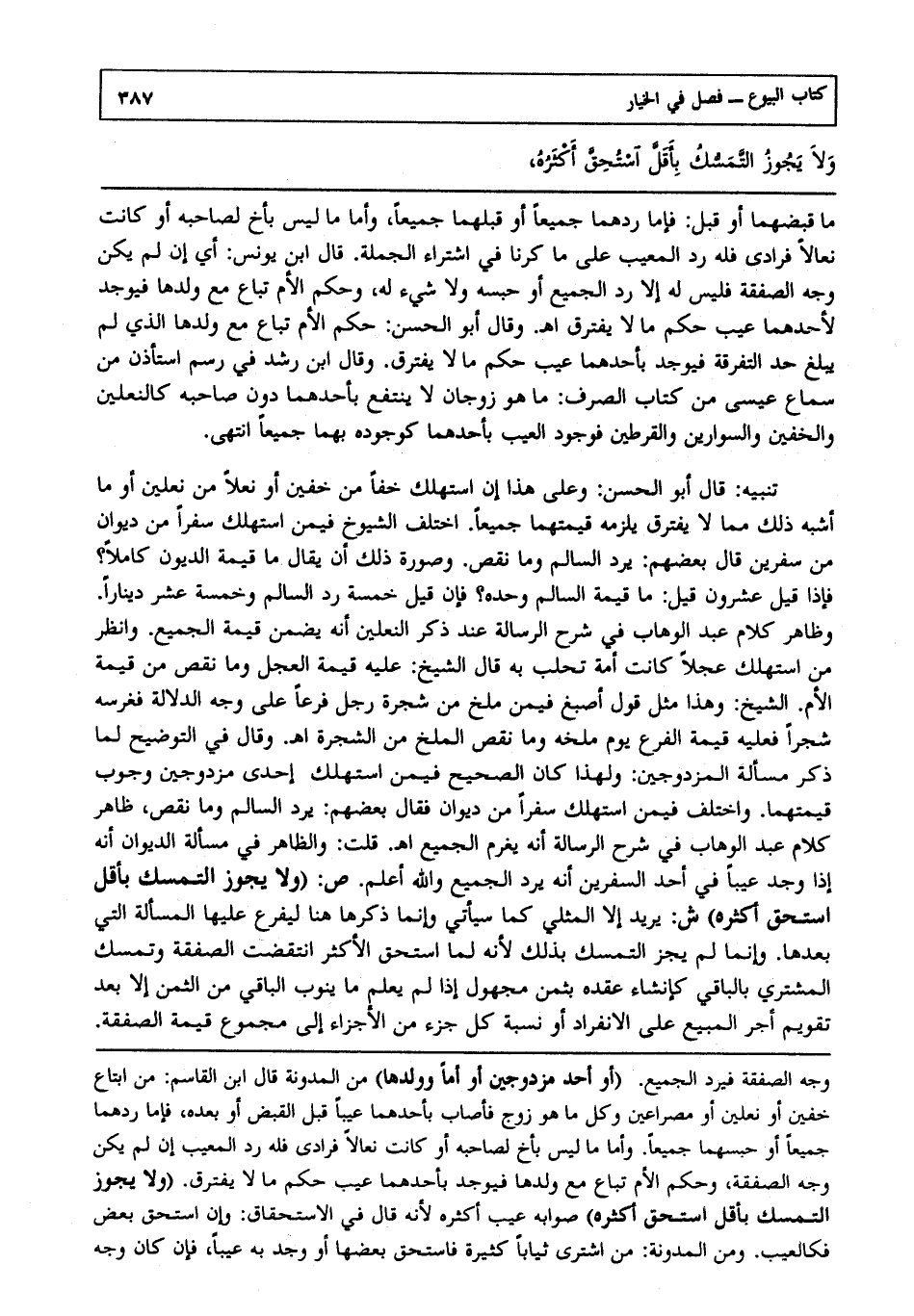 ما قبضهما، أو قبل فإما ردهما جميعا، أو قبلهما جميعا، وأما ما ليس بأخ لصاحبه، أو كانت نعالا فرادى فله رد المعيب على ما ذكرنا في اشتراء الجملة قال ابن يونس: أي إن لم يكن وجه الصفقة فليس له إلا رد الجميع، أو حبسه، ولا شيء له، وحكم الأم تباع مع ولدها فيوجد لأحدهما عيب حكم ما لا يفترق ا هـ. وقال أبو الحسن: حكم الأم تباع مع ولدها الذي لم يبلغ حد التفرقة فيوجد بأحدهما عيب حكم ما لا يفترق وقال ابن رشد في رسم استأذن من سماع عيسى من كتاب الصرف ما هو زوجان لا ينتفع بأحدهما دون صاحبه كالنعلين والخفين والسوارين والقرطين فوجود العيب بأحدهما كوجوده بهما جميعا انتهى.