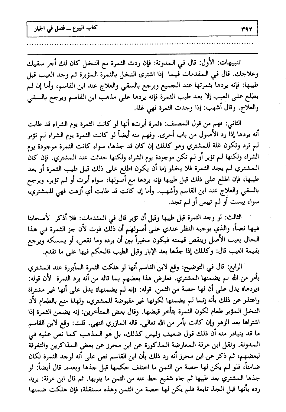 الرابع: قال في التوضيح: وقع لابن القاسم أنها لو هلكت الثمرة المأبورة عند المشتري بأمر من الله لم يضمنها المشتري فعارض هذا بعضهم بما قاله من أنه يرد الثمرة؛ لأن قوله: "يردها" يدل على أن لها حصة من الثمن قوله: "إنه لا يضمنها" يدل على أنها غير مشتراة، واعتذر عن ذلك بأنه إنما لم يضمنها لكونها غير مقبوضة للمشتري، ولهذا منع بالطعام؛ لأن النخل المؤبر طعام لكون الثمرة يتأخر قبضها، وقال بعض المتأخرين: إنه يضمن الثمرة إذا اشتراها بعد الزهو، وإن كانت بأمر من الله تعالى قاله المازري انتهى. قلت: وقع لابن القاسم ما قد يتبادر منه أن ذلك قول ضعيف، وليس كذلك بل هو المذهب كما نص عليه في المدونة، ونقل ابن عرفة المعارضة المذكورة عن ابن محرز عن بعض المذاكرين، والتفرقة لبعضهم، ثم ذكر عن ابن محرز أنه رد ذلك بأن ابن القاسم نص على أنه لو جذ الثمرة لكان ضامنا، فلو لم يكن لها حصة من الثمن ما اختلف حكمها قبل جذها، وبعده قال أيضا: لو جذها المشتري بعد طيبها، ثم جاء شفيع حط عنه من الثمن ما ينوبها، ثم قال ابن عرفة يريد رده بأنها قبل الجذ تابعة، فلم يكن لها حصة من الثمن، وهذه مستقلة، فإن هلكت ضمنها