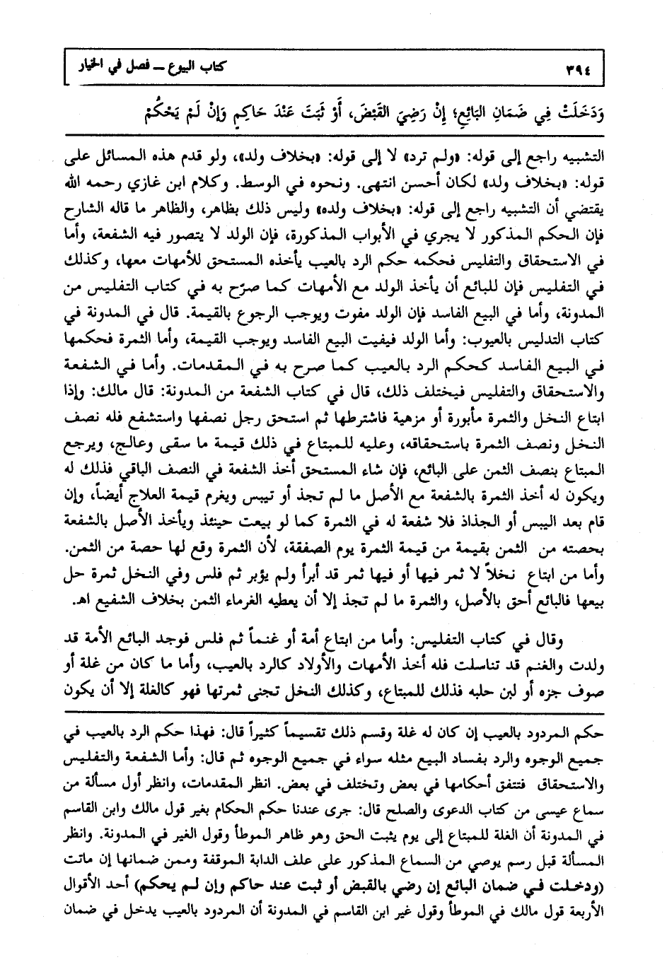 التشبيه راجع إلى قوله: ولم ترد لا إلى قوله: "بخلاف ولد" ولو قدم هذه المسائل على قوله: بخلاف ولد لكان أحسن انتهى. ونحوه في الوسط، وكلام ابن غازي - رحمه الله - يقتضي أن التشبيه راجع إلى قوله: "بخلاف ولده" وليس ذلك بظاهر والظاهر ما قاله الشارح فإن الحكم المذكور لا يجري في الأبواب المذكورة فإن الولد لا يتصور فيه الشفعة، وأما في الاستحقاق والتفليس فحكمه حكم الرد بالعيب يأخذه المستحق للأمهات معها، وكذلك في التفليس فإن للبائع أن يأخذ الولد مع الأمهات كما صرح به في كتاب التفليس من المدونة، وأما في البيع الفاسد فإن الولد مفوت، ويوجب الرجوع بالقيمة قال في المدونة في كتاب التدليس بالعيوب: وأما الولد فيفيت البيع الفاسد ويوجب القيمة، وأما الثمرة فحكمها في البيع الفاسد كحكم الرد بالعيب كما صرح به في المقدمات، وأما في الشفعة والاستحقاق والتفليس فيختلف ذلك. قال في كتاب الشفعة من المدونة. قال مالك: وإذا ابتاع النخل، والثمرة مأبورة، أو مزهية فاشترطها، ثم استحق رجل نصفها واستشفع فله نصف النخل، ونصف الثمرة باستحقاقه، وعليه للمبتاع في ذلك قيمة ما سقى وعالج، ويرجع المبتاع بنصف الثمن على البائع، فإن شاء المستحق أخذ الشفعة في النصف الباقي فذلك له، ويكون له أخذ الثمرة بالشفعة مع الأصل ما لم تجذ، أو تيبس، ويغرم قيمة العلاج أيضا، وإن قام بعد اليبس، أو الجذاذ فلا شفعة له في الثمرة كما لو بيعت حينئذ، ويأخذ الأصل بالشفعة بحصته من الثمن بقيمة من قيمة الثمرة يوم الصفقة؛ لأن الثمرة وقع لها حصة من الثمن، وأما من ابتاع نحلا لا ثمر فيها، أو فيها ثمر قد أبر، أو لم يؤبر، ثم فلس، وفي النخل ثمرة حل بيعها فالبائع أحق بالأصل والثمرة ما لم تجذ إلا أن يعطيه الغرماء الثمن بخلاف الشفيع ا هـ.
