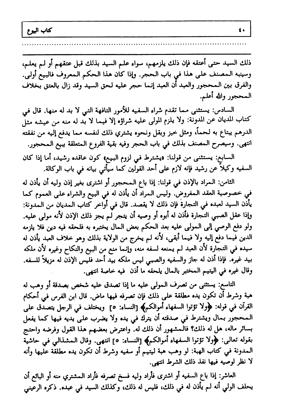 السادس: يستثنى مما تقدم شراء السفيه للأمور التافهة التي لا بد له منها قال في كتاب المديان من المدونة: ولا يلزم المولى عليه شراؤه إلا فيما لا بد له منه من عيشه مثل الدرهم يبتاع به لحما، ومثل خبز، وبقل، ونحوه يشتري ذلك لنفسه مما يدفع إليه من نفقته انتهى. وسيصرح المصنف بذلك في باب الحجر، وفيه بقية الفروع المتعلقة ببيع المحجور.