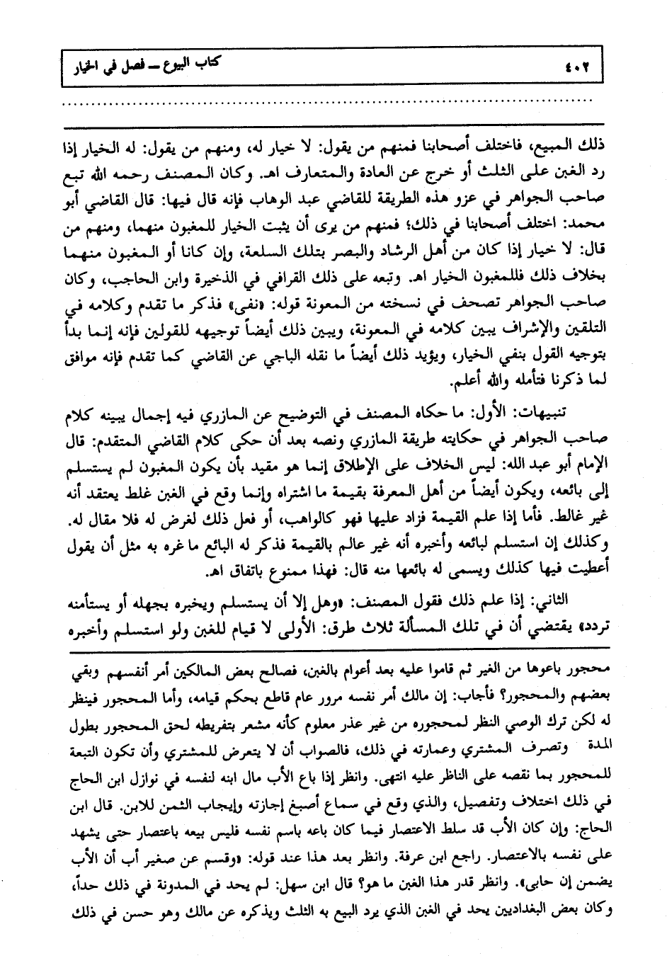 ذلك المبيع فاختلف أصحابنا فمنهم من يقول لا خيار له، ومنهم من يقول له الخيار إذا رد الغبن على الثلث، أو خرج عن العادة والمتعارف ا هـ. وكان المصنف - رحمه الله - تبع صاحب الجواهر في عزو هذه الطريقة للقاضي عبد الوهاب فإنه قال فيها. قال القاضي أبو محمد: اختلف أصحابنا في ذلك فمنهم من يرى أن يثبت الخيار للمغبون منهما، ومنهم من قال: لا خيار إذا كان من أهل الرشاد والبصر بتلك السلعة، وإن كانا، أو المغبون منهما بخلاف ذلك فللمغبون الخيار ا هـ. وتبعه على ذلك القرافي في الذخيرة وابن الحاجب، وكان صاحب الجواهر تصحف في نسخته من المعونة قوله نفي فذكر ما تقدم، وكلامه في التلقين والإشراف يبين كلامه في المعونة ويبين ذلك أيضا توجيهه للقولين فإنه إنما بدأ بتوجيه القول بنفي الخيار ويؤيد ذلك أيضا ما نقله الباجي عن القاضي كما تقدم فإنه موافق لما ذكرنا فتأمله والله أعلم.