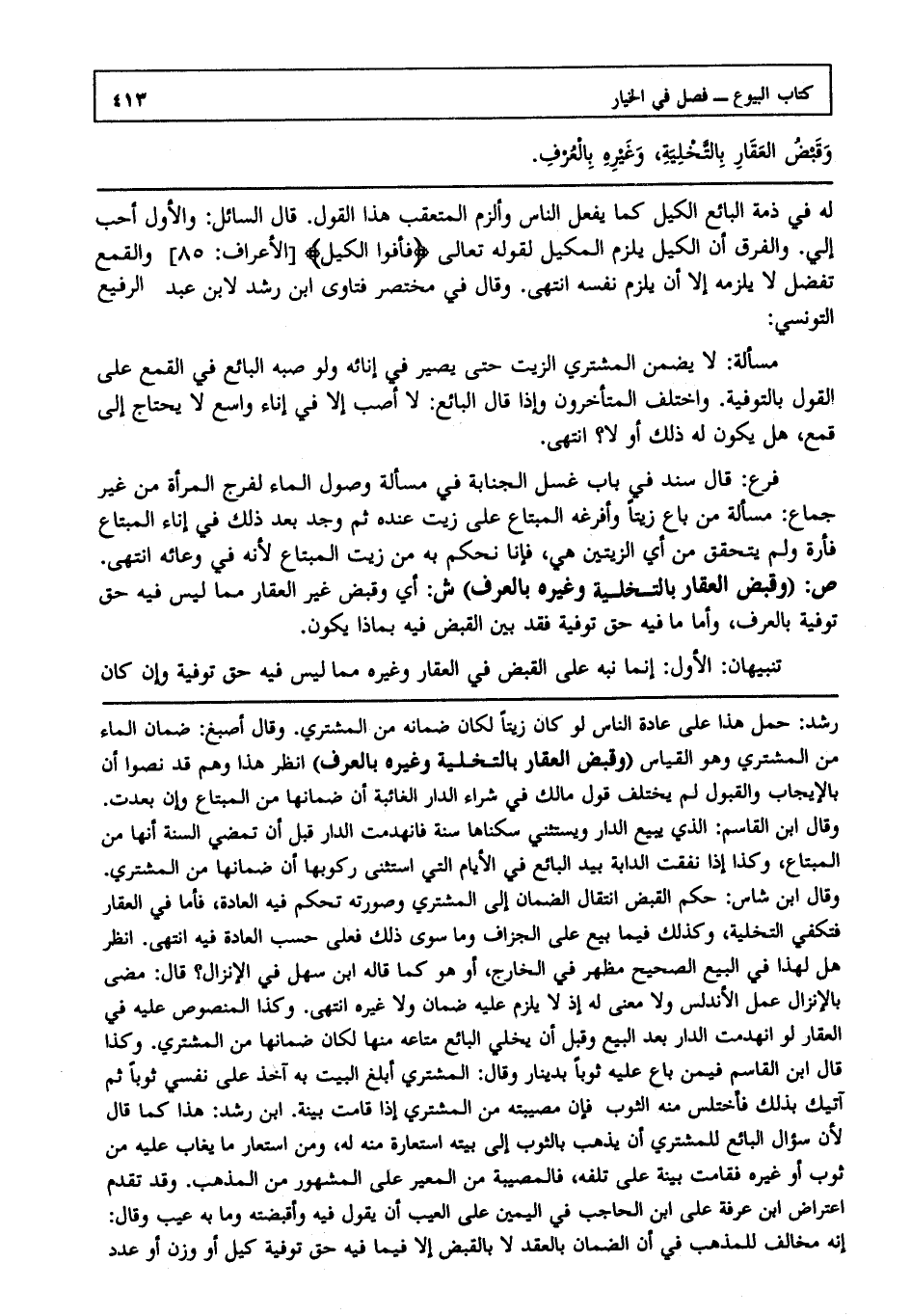فرع: قال سند في باب غسل الجنابة في مسألة وصول الماء لفرج المرأة من غير جماع مسألة من باع زيتا وأفرغه المبتاع على زيت عنده، ثم وجد بعد ذلك في إناء المبتاع فأرة، ولم يتحقق من أي الزيتين هي فإنا نحكم به من زيت المبتاع؛ لأنه في وعائه انتهى.ص: (وقبض العقار بالتخلية وغيره بالعرف) ش: أي وقبض غير العقار مما ليس فيه حق توفية بالعرف، وأما ما فيه حق توفية، فقد بين القبض فيه بماذا يكون. تنبيهات: الأول: إنما نبه على القبض في العقار وغيره مما ليس فيه حق توفية، وإن كان