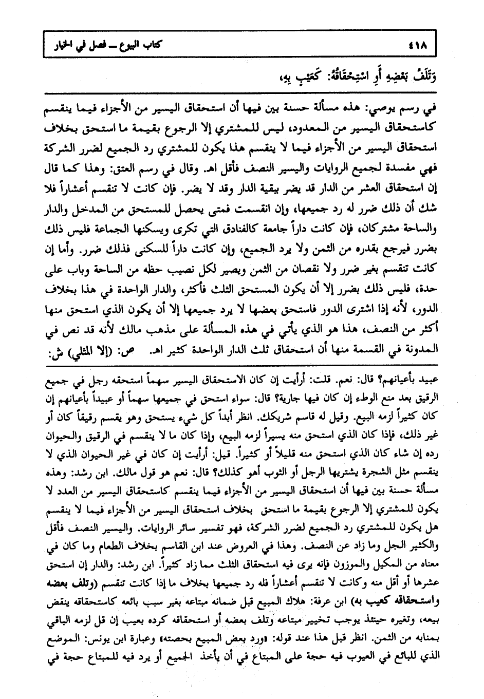في رسم يوصى: هذه مسألة حسنة بين فيها أن استحقاق اليسير من الأجزاء فيما ينقسم كاستحقاق اليسير من المعدود ليس للمشتري إلا الرجوع بقيمة ما استحق بخلاف استحقاق اليسير من الأجزاء فيما لا ينقسم هذا يكون للمشتري رد الجميع لضرر الشركة فهي مفسدة لجميع الروايات، واليسير النصف فأقل ا هـ. وقال في رسم العتق: وهذا كما. قال: إن استحقاق العشر من الدار قد يضر ببقية الدار، وقد لا يضر، فإن كانت لا تنقسم أعشارا فلا شك أن ذلك ضرر له رد جميعها، وإن انقسمت فمتى يحصل للمستحق من المدخل، والدار والساحة مشتركان، فإن كانت دارا جامعة كالفنادق التي تكرى ويسكنها الجماعة فليس ذلك بضرر فيرجع بقدره من الثمن، ولا يرد الجميع، وإن كانت دارا للسكنى فذلك ضرر، وأما إن كانت تنقسم بغير ضرر، ولا نقصان من الثمن، ويصير لكل نصيب حظه من الساحة، وباب على حدة فليس ذلك بضرر إلا أن يكون المستحق الثلث فأكثر، والدار الواحدة في هذا بخلاف الدور؛ لأنه إذا اشترى الدور فاستحق بعضها لا يرد جميعها إلا أن يكون الذي استحق منها أكثر من النصف هذا هو الذي يأتي في هذه المسألة على مذهب مالك؛ لأنه قد نص في المدونة في القسمة منها أن استحقاق ثلث الدار الواحدة كثير ا هـ. ص: (إلا المثلي) ش: