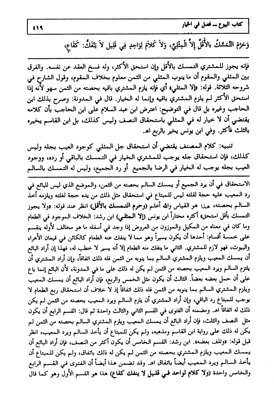 وحرم التمسك بالأقل إلا المثلي, ولا كلام لواحد في قليل لا ينفك: كقاع,