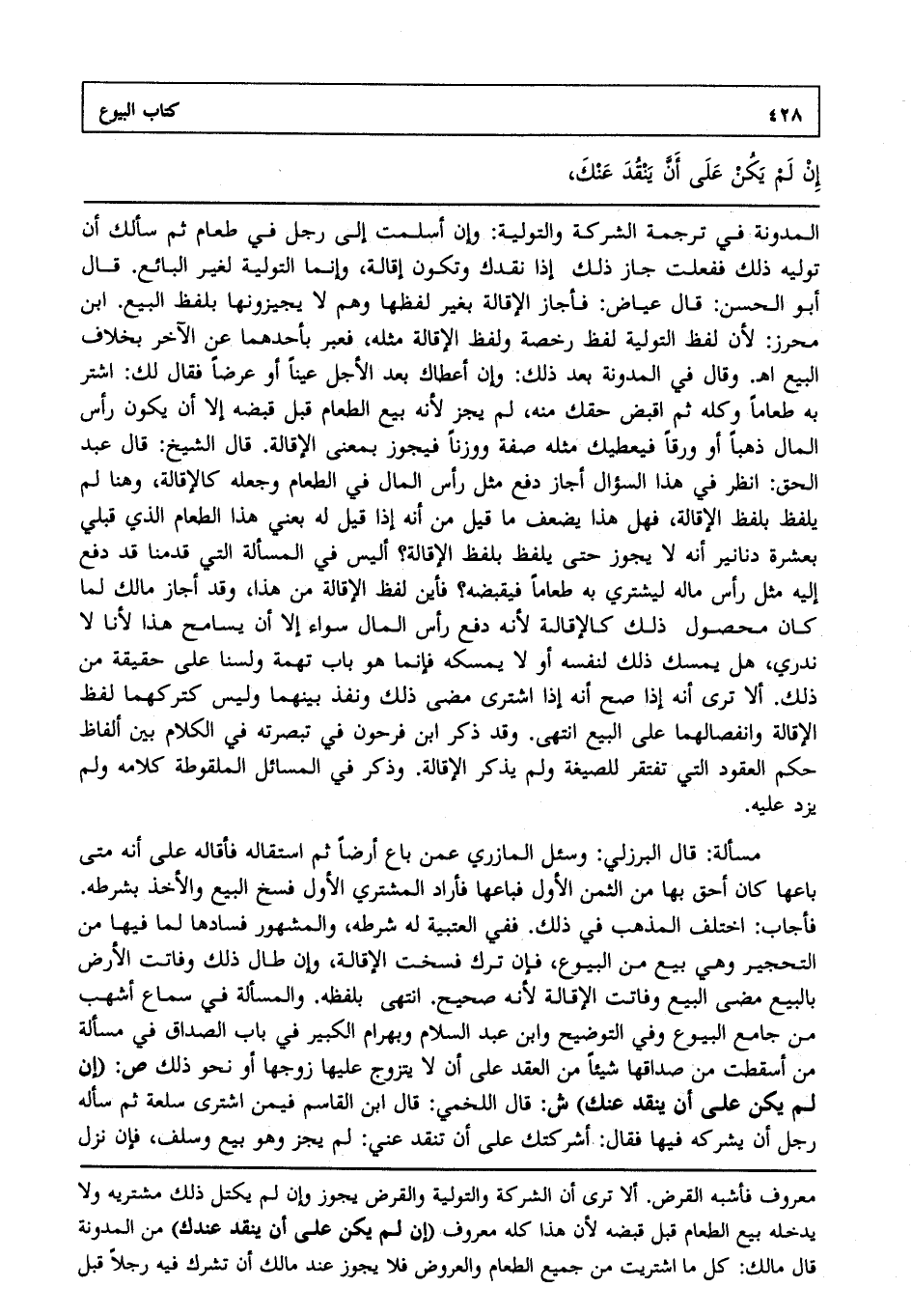 المدونة في ترجمة الشركة والتولية: وإن أسلمت إلى رجل في طعام، ثم سألك أن توليه ذلك ففعلت جاز ذلك إذا نقدك، وتكون إقالة، وإنما التولية لغير البائع. قال أبو الحسن قال عياض: فأجاز الإقالة بغير لفظها، وهم لا يجيزونها بلفظ البيع ابن محرز؛ لأن لفظ التولية لفظ رخصة، ولفظ الإقالة مثله فعبر بأحدهما عن الآخر بخلاف البيع ا هـ. وقال في المدونة بعد ذلك: وإن أعطاك بعد الأجل عينا، أو عرضا فقال لك: اشتر به طعاما وكله، ثم اقبض حقك منه لم يجز؛ لأنه بيع الطعام قبل قبضه إلا أن يكون رأس المال ذهبا، أو ورقا فيعطيك مثله صفة ووزنا فيجوز بمعنى الإقالة. قال الشيخ. قال عبد الحق انظر في هذا السؤال أجاز دفع مثل رأس المال في الطعام، وجعله كالإقالة، وهنا لم يلفظ بلفظ الإقالة، فهل هذا يضعف ما قيل من أنه إذا قيل له: بعني هذا الطعام الذي قبلي بعشرة دنانير أنه لا يجوز حتى يلفظ بلفظ الإقالة أليس في المسألة التي قدمنا قد دفع إليه مثل رأس ماله ليشتري به طعاما فيقبضه فأين لفظ الإقالة من هذا، وقد أجاز مالك لما كان محصول ذلك كالإقالة؛ لأنه دفع رأس المال سواء إلا أن يسامح هذا؛ لأنا لا ندري هل يمسك ذلك لنفسه، أو لا يمسكه فإنما هو باب تهمة، ولسنا على حقيقة من ذلك ألا ترى أنه إذا صح أنه إذا اشترى مضى ذلك ونفذ بينهما، وليس كتركهما لفظ الإقالة وانفصالهما على البيع ؟ انتهى. وقد ذكر ابن فرحون في تبصرته في الكلام بين ألفاظ حكم العقود التي تفتقر للصيغة، ولم يذكر الإقالة، وذكر في المسائل الملقوطة كلامه، ولم يزد عليه.