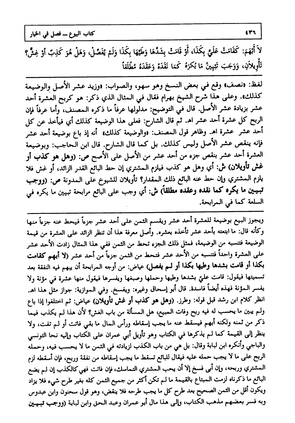 لا أبهم: كقامت علي بكذا, أو أقامت بشدها وطيها بكذا ولم يفصل, وهل هو كذب أو غش؟ تأويلان, ووجب تبيين ـــــــ