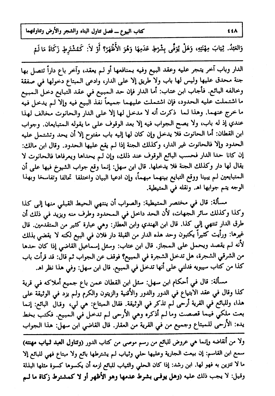 الدار وباب آخر يتجر عليه، وعقد البيع وفيه بمنافعها أو لم يعقد، وآخر باع دارا تتصل بها جنة محدق عليها، وليس لها باب ولا طريق إلا على الدار، وادعى المبتاع دخولها في صفقة وخالفه البائع، فأجاب ابن عتاب: أما الدار فإن حد المبيع في عقد التبايع دخل المبيع ما اشتملت عليه الحدود، فإن اشتملت عليهما جميعا نفذ البيع فيه، وإلا لم يدخل فيه ما خرج عنهما، وهذا لما ذكرت أنه لا مدخل لها إلا على الدار، والحانوت مخالف لهذا عندي إذ له باب، ولا يصح الجواب فيه إلا بعد الوقوف على ما يقوله المتبايعان، وجواب ابن القطان: أما الحانوت فلا يدخل وإن كان لها إليه باب مفتوح إلا أن يحد وتشتمل عليه الحدود وإلا فالحانوت غير الدار، وكذلك الجنة إذا لم يقع عليها الحدود، وقال ابن مالك: إن كانا حدا الدار فحسب البائع الوقوف عند ذلك وإن لم يحداها ويعرفاها، فالحانوت لا يقال لها دار وكذلك الجنة فلا يدخلها، قال ابن سهل إنما وقع جواب الشيوخ فيها على أن المتبايعين لم يبينا ووقع التبايع بينهما مبهما وإن ادعيا البيان واختلفا تحالفا وتفاسخا وبهذا الوجه يتم جوابها ا هـ. ونقله في المتيطية. مسألة: قال في مختصر المتيطية: والصواب أن ينتهي الحيط القبلي منها إلى كذا وكذا، وكذلك سائر الجهات؛ لأن الحد داخل في المحدود وطرف منه ويزيد في ذلك أن طرق الدار تنتهي إلى كذا، قال ابن الهندي وابن العطار: وهي عبارة كثير من المتقدمين، قال غيرها ورأيت كثيرا يكتبون وحد هذه الدار من القبلة دار فلان في البيع لكنه لا يقضى بذلك؛ لأنه لم يقصد، ويحمل على المجاز قال ابن عتاب: وسئل إسماعيل القاضي إذا كان حدها من الشرقي الشجرة، هل تدخل الشجرة في المبيع ؟ فوقف عن الجواب، ثم قال قد: قرأت باب كذا من كتاب سيبويه فدلني على أنها تدخل في المبيع قال ابن سهل: وفي هذا نظر ا هـ.