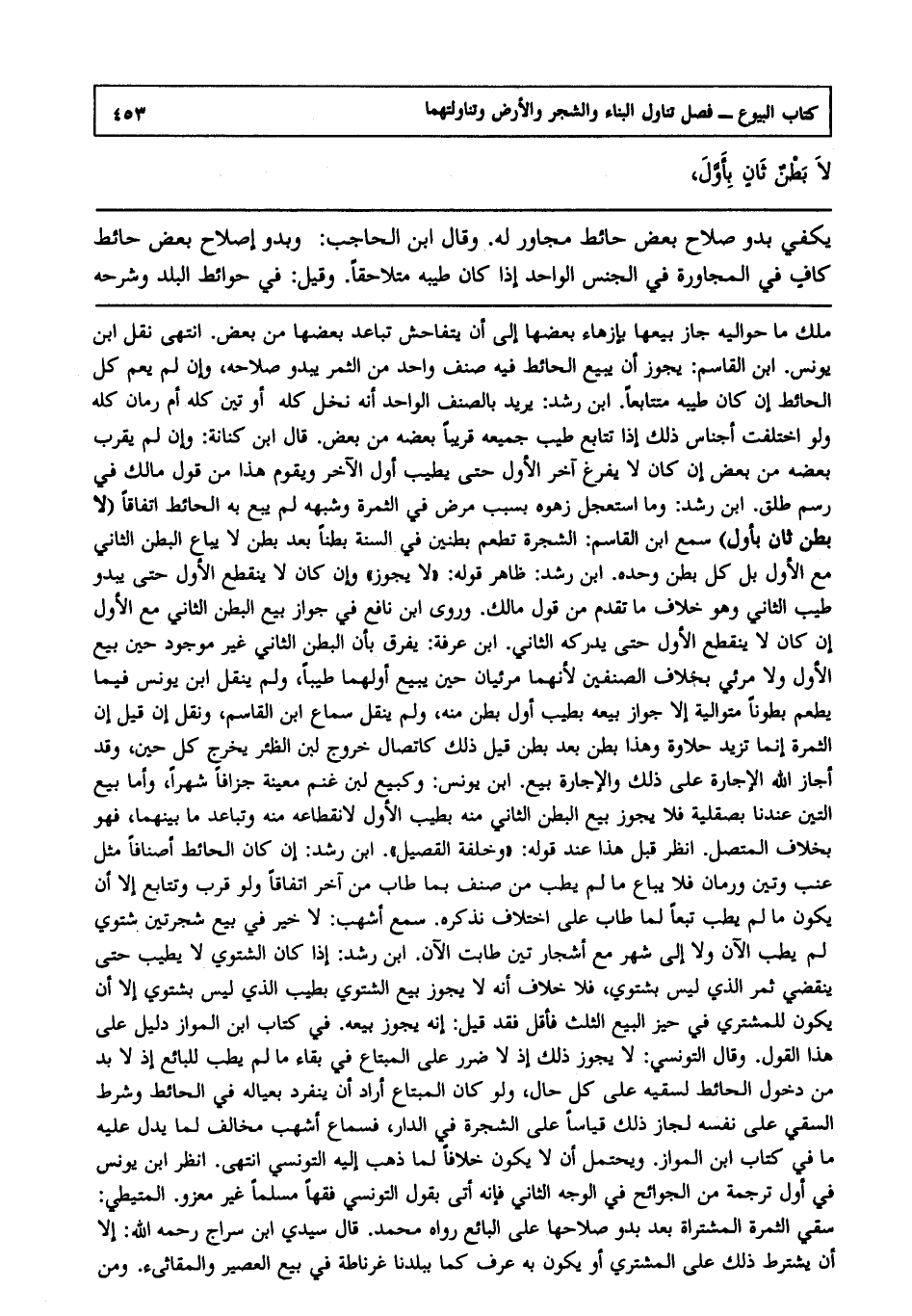 يكفي بدو صلاح بعض حائط مجاور له. وقال ابن الحاجب: وبدو صلاح بعض حائط كاف في المجاورة في الجنس الواحد إذا كان طيبه متلاحقا. وقيل: في حوائط البلد، وشرحه