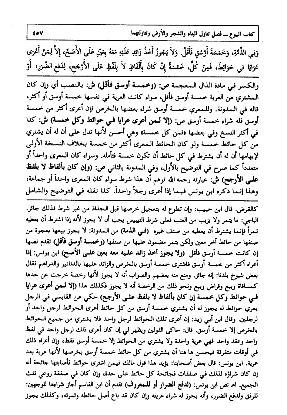 والكسر في مادة الذال المعجمة. ص: (وخمسة أوسق فأقل) ش: بالنصب أي: وإن كان المشترى من العرية خمسة أوسق فأقل سواء كانت العرية في نفسها خمسة أوسق أو أكثر قاله في المدونة وللمعري خمسة أوسق شراء بعضها بالخرص فإن أعرى أكثر من خمسة أوسق فله شراء خمسة أوسق. ص: (إلا لمن أعرى عرايا في حوائط وكل خمسة) ش: كذا في أكثر النسخ وفي بعضها فمن كل خمسة وهي أحسن؛ لأنها تدل على أن له أن يشتري من كل حائط خمسة ولو كان الحائط المعرى أكثر من خمسة بخلاف النسخة الأولى لإيهامها أن له أن يشترط في كل حائط أن تكون خمسة فتأمله وسواء كان المعرى واحدا أو متعددا كما صرح في التوضيح بالأول وفي المدونة بالثاني. ص: (وإن كان بألفاظ لا بلفظ على الأرجح) ش: عبارته رحمه الله توهم أن هذا شرط سواء كان المعرى واحدا أو جماعة، وهذا إنما ذكره ابن يونس فيما إذا أعرى رجلا واحدا كذا نقله في التوضيح والشامل