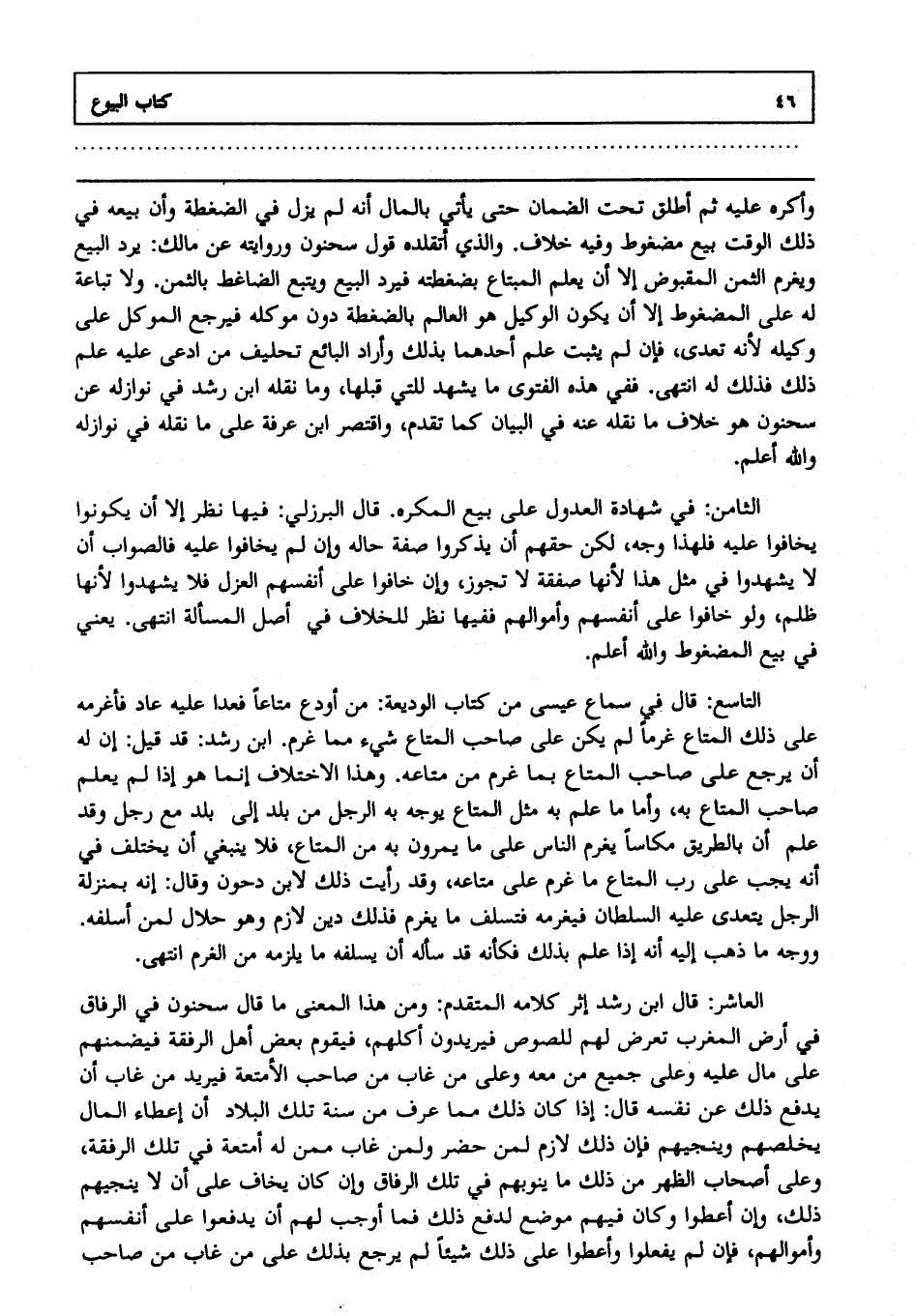 العاشر: قال ابن رشد: إثر كلامه المتقدم، ومن هذا المعنى ما قال سحنون في الرفاق في أرض المغرب تعرض لهم اللصوص فيريدون أكلهم فيقوم بعض أهل الرفقة فيضمنهم على مال عليه، وعلى جميع من معه، وعلى من غاب من صاحب الأمتعة فيريد من غاب أن يدفع ذلك عن نفسه قال إذا كان ذلك مما عرف من سنة تلك البلاد أن إعطاء المال يخلصهم وينجيهم فإن ذلك لازم لمن حضر، ولمن غاب ممن له أمتعة في تلك الرفقة، وعلى أصحاب الظهر من ذلك ما ينوبهم في تلك الرفاق وإن كان يخاف أن لا ينجيهم ذلك، وإن أعطوا، وكان فيهم موضع لدفع ذلك فما أوجب لهم أن يدفعوا على أنفسهم، وأموالهم فإن لم يفعلوا، وأعطوا على ذلك شيئا لم يرجع بذلك على من غاب من صاحب