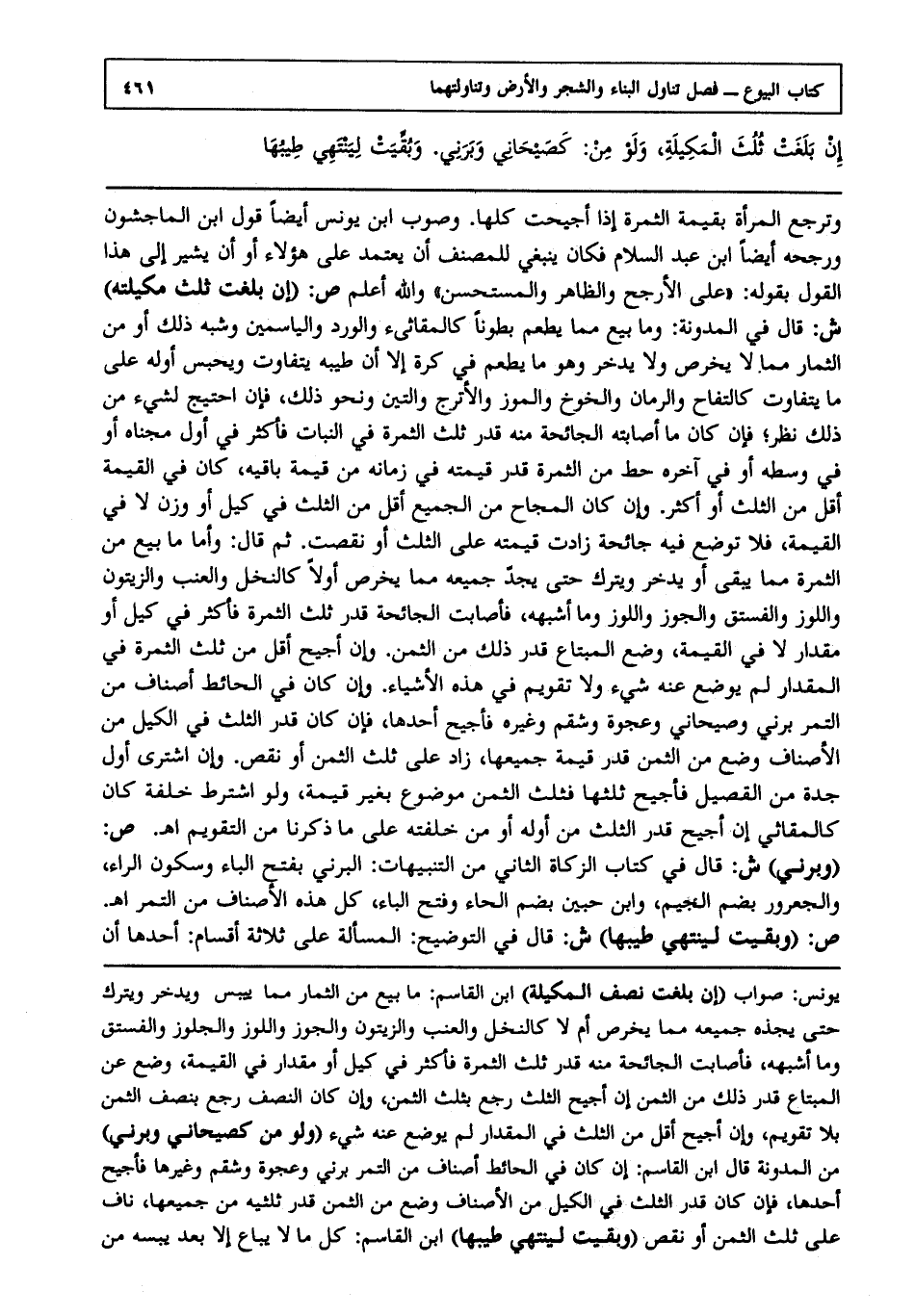وترجع المرأة بقيمة الثمرة إذا أجيحت كلها وصوب ابن يونس أيضا قول ابن الماجشون ورجحه أيضا ابن عبد السلام فكان ينبغي للمصنف أن يعتمد على هؤلاء أو أن يشير إلى هذا القول بقوله على الأرجح والظاهر والمستحسن، والله أعلم. ص: (إن بلغت ثلث مكيلته) ش: قال في المدونة وما بيع مما يطعم بطونا كالمقاثئ والورد والياسمين وشبه ذلك أو من الثمار مما لا يخرص ولا يدخر، وهو ما يطعم في كرة إلا أن طيبه يتفاوت ويحبس أوله على ما يتفاوت كالتفاح والرمان والخوخ والموز والأترج والتين ونحو ذلك فإن احتيج لشيء من ذلك نظر فإن كان ما أصابته الجائحة منه قدر ثلث الثمرة في النبات فأكثر في أول مجناه أو في وسطه أو في آخره حط من الثمرة قدر قيمته في زمانه من قيمة باقيه كان في القيمة أقل من الثلث أو أكثر وإن كان المجاح من الجميع أقل من الثلث في كيل أو وزن لا في القيمة فلا توضع فيه جائحة زادت قيمته على الثلث أو نقصت، ثم قال وأما ما بيع من الثمرة مما ينبغي أو يدخر ويترك حتى يجد جميعه مما يخرص أولا كالنخل والعنب والزيتون واللوز والفستق والجوز واللوز وما أشبهه فأصابت الجائحة قدر ثلث الثمرة فأكثر في كيل أو مقدار لا في القيمة وضع المبتاع قدر ذلك من الثمن وإن أجيح أقل من ثلث الثمرة في المقدار لم يوضع عنه شيء ولا تقويم في هذه الأشياء وإن كان في الحائط أصناف من التمر برني وصيحاني وعجوة وشقم وغيره فأجيح أحدها فإن كان قدر الثلث في الكيل من الأصناف وضع من الثمن قدر قيمة جميعها زاد على ثلث الثمن أو نقص وإن اشترى أول جدة من القصيل فأجيح ثلثها فثلث الثمن موضوع بغير قيمة ولو اشترط خلفة كان كالمقاثئ إن أجيح قدر الثلث من أوله ومن خلفته على ما ذكرنا من التقويم ا هـ. ص: (وبرني) ش: قال في كتاب الزكاة الثاني من التنبيهات البرني بفتح الباء وسكون الراء والجعرور بضم الجيم وابن حبين بضم الحاء وفتح الباء كل هذه الأصناف من التمر ا هـ. ص: (وبقيت لينتهي طيبها) ش: قال في التوضيح المسألة على ثلاثة أقسام: أحدها أن