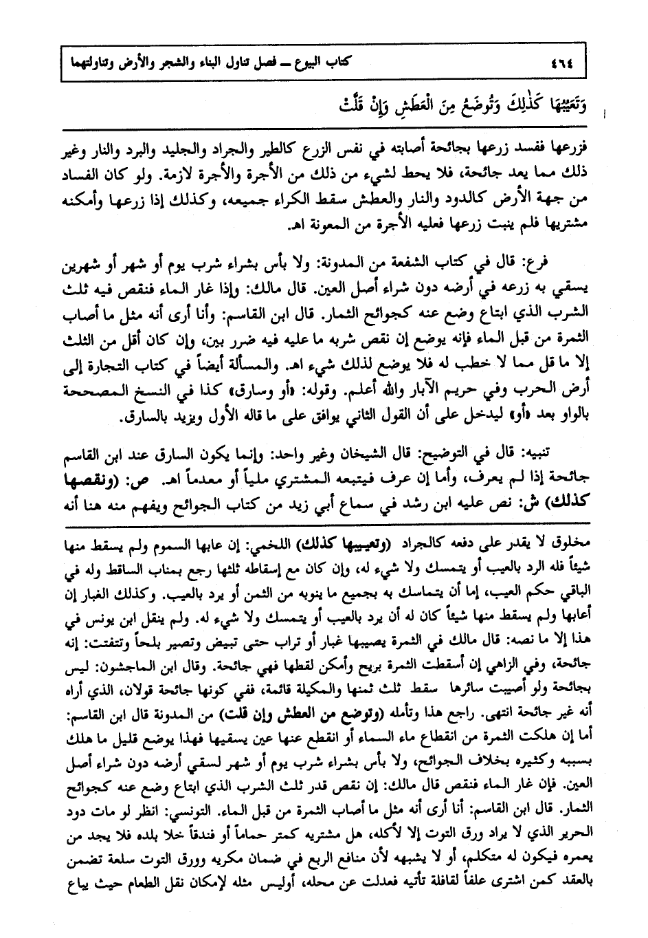 فرع: قال في كتاب الشفعة من المدونة: ولا بأس بشراء شرب يوم أو شهر أو شهرين يسقي به زرعه في أرضه دون شراء أصل العين قال مالك وإذا غار الماء فنقص فيه ثلث الشرب الذي ابتاع وضع عنه كجوائح الثمار قال ابن القاسم وأنا أرى أنه مثل ما أصاب الثمرة من قبل الماء فإنه يوضع إن نقص شربه ما عليه فيه ضرر بين وإن كان أقل من الثلث إلا ما قل مما لا خطب له فلا يوضع لذلك شيء ا هـ. والمسألة أيضا في كتاب التجارة إلى أرض الحرب وفي حريم الآبار، والله أعلم. وقوله: "أو وسارق" كذا في النسخ المصححة بالواو بعد أو ليدخل على أن القول الثاني يوافق على ما قاله الأول ويزيد بالسارق. تنبيه: قال في التوضيح قال الشيخان وغير واحد، وإنما يكون السارق عند ابن القاسم جائحة إذا لم يعرف وأما إن عرف فيتبعه المشتري مليا أو معدما ا هـ. ص: (ونقصها كذلك) ش: نص عليه ابن رشد في سماع أبي زيد من كتاب الجوائح ويفهم منه هنا أنه