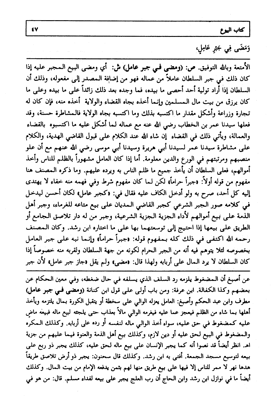 الأمتعة، وبالله التوفيق.ص: (ومضى في جبر عامل) ش: أي، ومضى البيع المجبر عليه إذا كان ذلك في جبر السلطان عاملا من عماله فهو من إضافة المصدر إلى مفعوله، وذلك أن السلطان إذا أراد تولية أحد أحصى ما بيده فما وجده بعد ذلك زائدا على ما بيده، وعلى ما كان يرزق من بيت مال المسلمين، وإنما أخذه بجاه القضاء والولاية أخذه منه فإن كان له تجارة وزراعة، وأشكل مقدار ما اكتسبه بذلك وما اكتسبه بجاه الولاية فالمشاطرة حسنة، وقد فعلها سيدنا عمر بن الخطاب رضي الله عنه مع عماله لما أشكل عليه ما اكتسبوه بالقضاء والعمالة، ويأتي ذلك في القضاء إن شاء الله عند الكلام على قبول القاضي الهدية والكلام على مشاطرة سيدنا عمر لسيدنا أبي هريرة وسيدنا أبي موسى رضي الله عنهم مع أن علو منصبهم، ومرتبتهم في الورع والدين معلومة أما إذا كان العامل مشهورا بالظلم للناس وأخذ أموالهم فعلى السلطان أن يأخذ جميع ما ظلم الناس به ويرده عليهم، وما ذكره المصنف هنا مفهوم من قوله أولا "جبرا حراما" لكن لما كان مفهوم شرط، وفي فهمه منه خفاء لا يهتدي إليه كل أحد صرح به ولو أدخل الكاف عليه، فقال في كجبر عامل لكان أحسن ليدخل في كلامه صور الجبر الشرعي كجبر القاضي المديان على بيع متاعه للغرماء، وجبر أهل الذمة على بيع أموالهم لأداء الجزية الشرعية، وجبر من له دار تلاصق الجامع أو الطريق على بيعها إذا احتيج إلى توسعتهما بها على ما اختاره ابن رشد وكان المصنف رحمه الله اكتفى في ذلك كله بمفهوم قوله جبرا حراما، وإنما نبه على جبر العامل بخصوصه لئلا يتوهم فيه أنه من الجبر الحرام لكونه من جهة السلطان، ولقربه منه خصوصا إذا كان السلطان لا يرد المال على أربابه، ولهذا قال "مضى" ولم يقل "جاز جبر عامل" لأن جبر