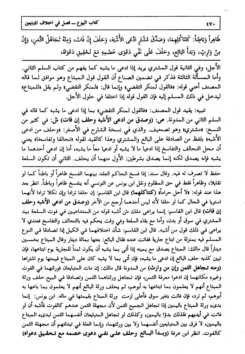 ظاهرا وباطنا: كتناكلهما, وصدق مشتر ادعى الأشبه, وحلف إن فات, ومنه تجاهل الثمن, وإن من وارث, وبدأ البائع, وحلف على نفي دعوى خصمه مع تحقيق دعواه,