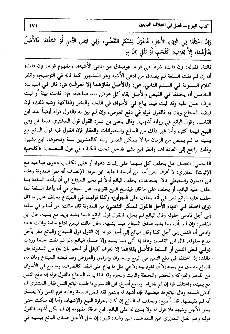 فائتة فقوله: إن فات شرط في قوله وصدق من ادعى الأشبه، ومفهوم قوله إن فات أنه إن لم تفت السلعة لم يصدق من ادعى الأشبه، وهو المشهور كما قاله في التوضيح وانظر كلام المدونة في السلم الثاني. ص: (فالأصل بقاؤهما إلا لعرف) ش: قال في اللباب الخامس أن يختلفا في القبض والأصل بقاء كل عوض بيد صاحبه فإن قامت بينة أو ثبت عرف عمل عليه وقد ثبت فيما يباع في الأسواق في اللحم والخبز والفاكهة وشبه ذلك فإن قبضه المبتاع وبان به فالقول قوله: في دفع العوض وإن لم يبن به فالقول قوله: أيضا عند ابن القاسم وقول البائع في رواية أشهب، وقال يحيى بن عمر القول قول المشتري فيما قل وفي البيع فيما كثر وأما غير ذلك من السلع والحيوانات والعقار فإن القول فيه قول البائع مع يمينه ما لم يمض من الزمان ما لا يمكن الصبر إليه كالعشرين سنة ونحوها ابن بشير وذلك راجع إلى العادة ا هـ. وانظر ابن بشير فدخل تحت الكاف في قول المصنف "كلحم"