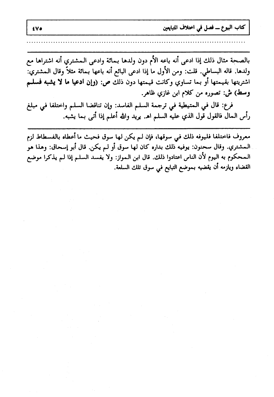 بالصحة مثال ذلك إذا ادعى أنه باعه الأم دون ولدها بمائة وادعى المشتري أنه اشتراها مع ولدها قاله البساطي قلت: ومن الأول ما إذا ادعى البائع أنه باعها بمائة مثلا، وقال المشتري اشتريتها بقيمتها أو بما تساوي وكان قيمتها دون ذلك. ص: (وإن ادعيا ما لا يشبه فسلم وسط) ش: تصوره من كلام ابن غازي ظاهر.
