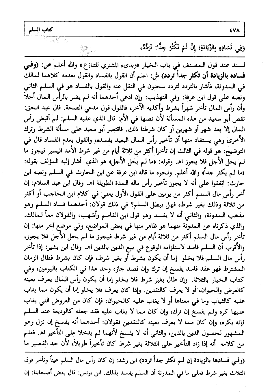 لسند عند قول المصنف في باب الخيار وبدئ المشتري للتنازع، والله أعلم.ص: (وفي فساده بالزيادة أن تكثر جدا تردد) ش: اعلم أن القول بالفساد والقول بعدمه كلاهما لمالك في المدونة فأشار بالتردد لتردد سحنون في النقل عنه والقول بالفساد هو في السلم الثاني، ونصه على قول ابن عرفة وفي التهذيب: وإن ادعى أحدهما أنه لم يضرب لرأس المال أجلا، وأن رأس المال تأخر شهرا بشرط وأكذبه الآخر فالقول قول مدعي الصحة قال عبد الحق نقص أبو سعيد من هذه المسألة؛ لأن نصها في الأم قال الذي عليه السلم: لم أقبض رأس المال إلا بعد شهر أو شهرين أو كان شرطنا ذلك فاقتصر أبو سعيد على مسألة الشرط وترك الأخرى وهي يستفاد منها أن تأخير رأس المال البعيد يفسده والقول بعدم الفساد قال في التوضيح: هو قوله في الثالث إن تأخرا أكثر من ثلاثة أيام من غير شرط الأمد اليسير فيجوز ما لم يحل الأجل فلا يجوز ا هـ. وقوله: ما لم يحل الأجل هو الذي أشار إليه المؤلف بقوله ما لم يكثر جدا، والله أعلم. ونحوه ما قاله ابن عرفة عن ابن الحارث في السلم، ونصه ابن حارث: اتفقوا على أنه لا يجوز تأخير رأس ماله المدة الطويلة ا هـ. وقال ابن عبد السلام: إن أخر رأس مال السلم أكثر من يومين على القول الأول يعني في كلام ابن الحاجب أو أكثر من ثلاثة وذلك بغير شرط فهل يبطل السلم، في ذلك قولان أحدهما فساد السلم، وهو مذهب المدونة والثاني أنه لا يفسد، وهو قول ابن القاسم وأشهب والقولان معا لمالك والذي ذكرناه عن المدونة منهما هو ظاهر منها في بعض المواضع وفي موضع آخر منها إن تأخر رأس مال السلم أكثر من ثلاثة أيام من غير شرط فيجوز ما لم يحل الأجل فلا يجوز، والأقرب أن السلم فاسد لاستلزامه الوقوع في بيع الدين بالدين ا هـ. وقال ابن بشير: إذا تأخر رأس مال السلم فلا يخلو إما أن يكون بشرط أو بغير شرط فإن كان بشرط فطال الزمان المشترط فهو عقد فاسد يفسخ إن ترك وإن قصد جاز وحد هذا في الكتاب باليومين وفي كتاب الخيار بالثلاثة وإن طال بغير شرط فلا يخلو إما أن يكون رأس المال يعرف بعينه كالعرض والحيوان أو لا يعرف كالنقدين وإذا كان يعرف فلا يخلو إما أن يكون مما يغاب عليه كالثياب وما في معناها أو لا يغاب عليه كالحيوان فإن كان من العروض التي يغاب عليها كره ولم يفسخ إن ترك وإن كان مما لا يغاب عليه فقد جعله كالوديعة عند السلم فإنه يكره وإن كان مما لا يعرف بعينه كالنقدين فقولان: أحدهما أنه يفسخ إن نزل، وهو المشهور لحصول الدين بالدين، والثاني أنه لا يفسخ؛ لأنهما لم يدخلا على التأخير ا هـ. فعلم من كلامه أنه إذا زاد التأخير على الثلاثة بغير شرط كان تأخيرا طويلا؛ لأن حد القصير ما