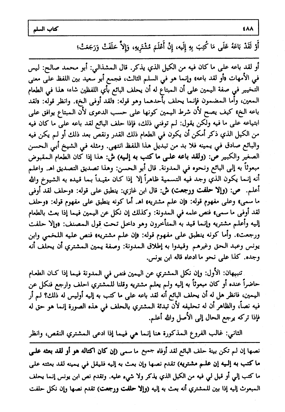 أو لقد باعه على ما كان فيه من الكيل الذي يذكر. قال المشذالي: أبو محمد صالح: ليس في الأمهات "أو لقد باعه"وإنما هو في السلم الثالث,فجمع أبو سعيد بين اللفظين علي معنى التخيير في صفة اليمين على أن المبتاع له أن يحلف البائع بأي اللفظين شاء هذا في الطعام المعين وأما المضمون فإنما يحلف بأحدهما، وهو قوله: "لقد أوفى إلخ" وانظر قوله لقد باعه إلخ كيف يصح؛ لأن شرط اليمين كونها على حسب الدعوى؛ لأن المبتاع يوافق على ابتياعه على ما فيه ولكن يقول لم توفني ذلك فإذا حلف البائع لقد باعه على ما كان فيه من الكيل الذي ذكر أمكن أن يكون في الطعام ذلك القدر ونقص بعد ذلك أو لم يكن فيه والبائع صادق في يمينه فلا بد من تبديل هذا اللفظ انتهى. ومثله في الشيخ أبي الحسن الصغير والكبير. ص: (ولقد باعه على ما كتب به إليه) ش: هذا إذا كان الطعام المقبوض مبعوثا به إلى البائع ونحوه في المدونة قال أبو الحسن: وهذا تصديق التصديق ا هـ. واعلم أنه إنما يكون الذي وجد فيه التسمية ظاهرا إلا إذا كان مقيدا بما قيده به الشيوخ، والله أعلم. ص: (وإلا حلفت ورجعت) ش قال ابن غازي: ينطبق على قوله: "وحلف لقد أوفى ما سمى" وعلى مفهوم قوله "إن علم مشتريه" ا هـ. أما كونه ينطبق على مفهوم قوله وحلف لقد أوفى ما سمى فنص عليه في المدونة وكذلك إن نكل عن اليمين فيما إذا بعث بالطعام إليه وأعلم مشتريه، وإنما قيد به المتأخرون، وهو داخل تحت قول المصنف وإلا حلفت ورجعت وأما كونه ينطبق على مفهوم قوله "إن علم مشتريه" فنص عليه اللخمي وابن يونس وعبد الحق وغيرهم وقيدوا به إطلاق المدونة وصفة يمين المشتري عن اليمين أن يحلف أنه وجده كذا على نحو ما ادعاه، قاله ابن يونس.