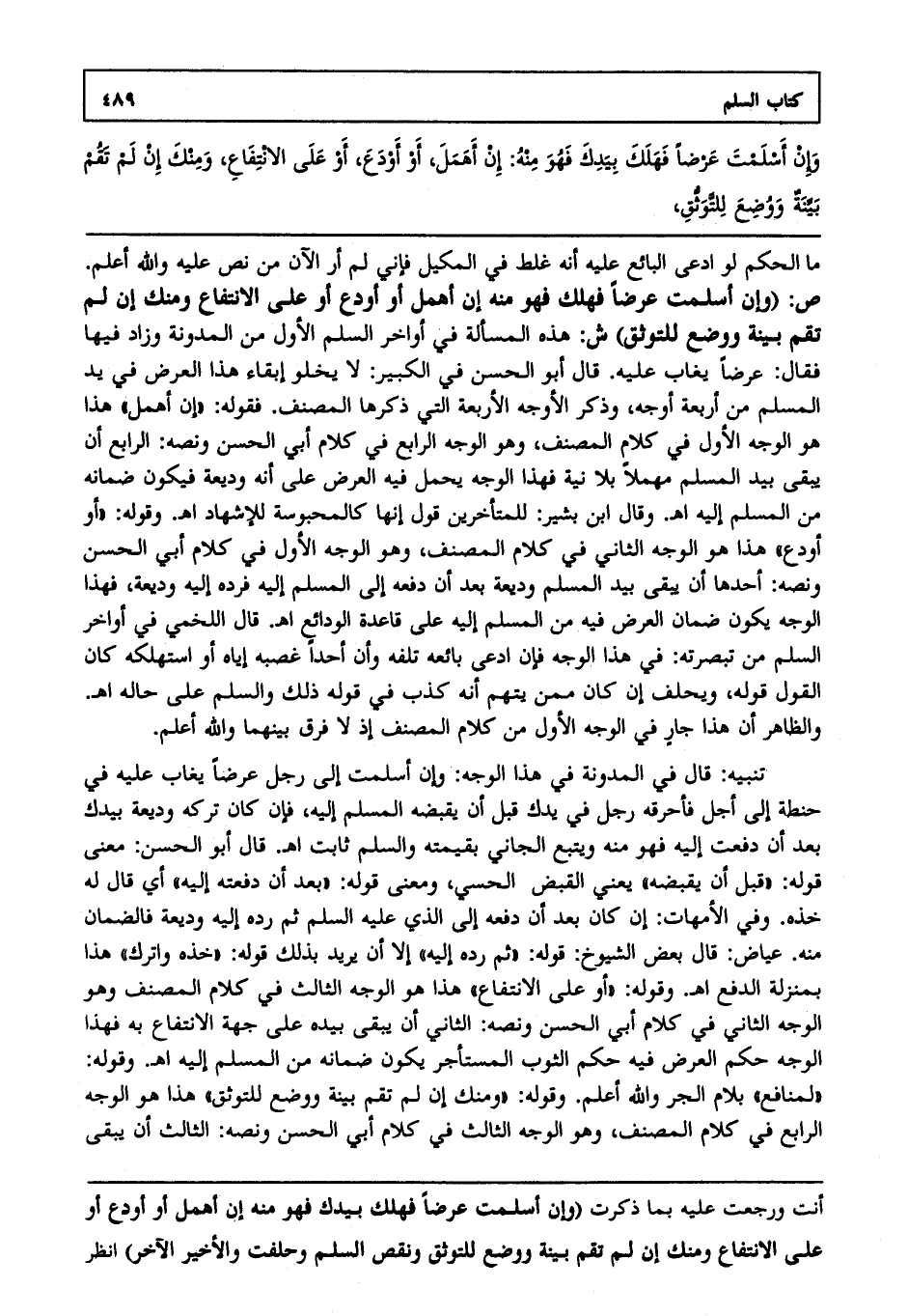 ما الحكم لو ادعى البائع عليه أنه غلط في المكيل فإني لم أر الآن من نص عليه، والله أعلم ص: (وإن أسلمت عرضا فهلك فهو منه إن أهمل أو أودع أو على الانتفاع ومنك إن لم تقم بينة ووضع للتوثق) ش: هذه المسألة في أواخر السلم الأول من المدونة وزاد فيها فقال عرضا يغاب عليه قال أبو الحسن في الكبير: لا يخلو إبقاء هذا العرض في يد المسلم من أربعة أوجه وذكر الأوجه الأربعة التي ذكرها المصنف فقوله: إن أهمل، هذا هو الوجه الأول في كلام المصنف، وهو الوجه الرابع في كلام أبي الحسن، ونصه: الرابع أن يبقى بيد المسلم مهملا بلا نية فهذا الوجه يحمل فيه العرض على أنه وديعة فيكون ضمانه من المسلم إليه ا هـ. وقال ابن بشير للمتأخرين: قول أنها كالمحبوسة للإشهاد ا هـ. وقوله: أو أودع هذا هو الوجه الثاني في كلام المصنف، وهو الوجه الأول في كلام أبي الحسن ونصه: أحدها أن يبقى بيد المسلم وديعة بعد أن دفعه إلى المسلم إليه فرده إليه وديعة فهذا الوجه يكون ضمان العرض فيه من المسلم إليه على قاعدة الودائع ا هـ. قال اللخمي في أواخر السلم من تبصرته في هذا الوجه: فإن ادعى بائعه تلفه وإن أحدا غصبه إياه أو استهلكه كان القول قوله ويحلف إن كان ممن يتهم أنه كذب في قوله ذلك والسلم على حاله ا هـ. والظاهر أن هذا جار في الوجه الأول من كلام المصنف إذ لا فرق بينهما، والله أعلم.