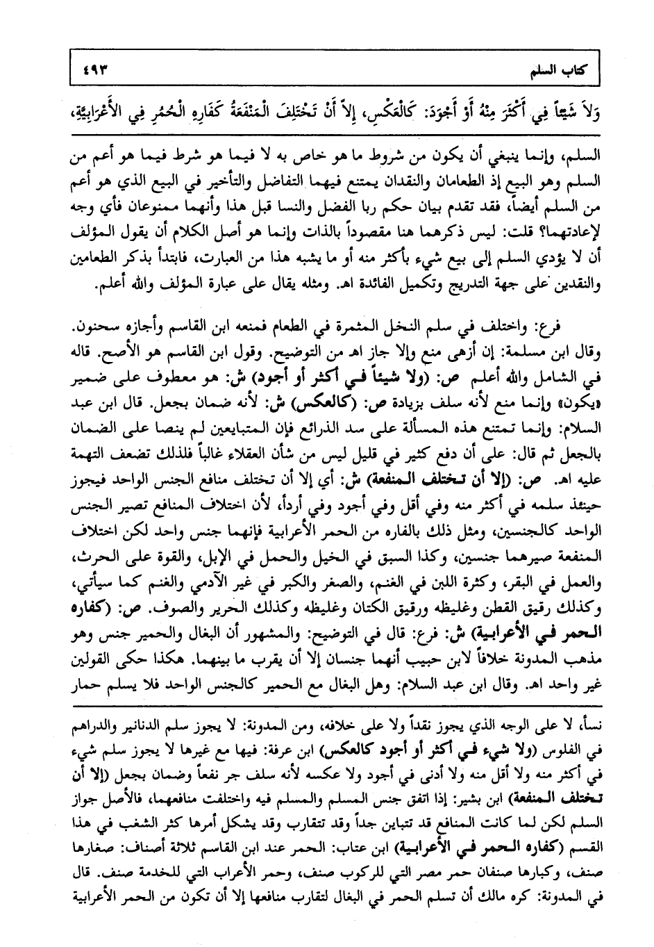 فرع: واختلف في سلم النخل المثمرة في الطعام فمنعه ابن القاسم وأجازه سحنون، وقال ابن مسلمة: إن أزهى منع وإلا جاز ا هـ. من التوضيح وقول ابن القاسم هو الأصح قاله في الشامل، والله أعلم. ص: (ولا شيئا في أكثر أو أجود) ش: هو معطوف على ضمير يكون، وإنما منع؛ لأنه سلف بزيادة. ص: (كالعكس) ش:؛ لأنه ضمان بجعل قال ابن عبد السلام: وإنما تمتنع هذه المسألة على سد الذرائع فإن المتبايعين لم ينصا على الضمان بالجعل، ثم قال: على أن دفع كثير في قليل ليس من شأن العقلاء غالبا فلذلك تضعف التهمة عليه ا هـ.ص: (إلا أن تختلف المنفعة) ش: أي إلا أن تختلف منافع الجنس الواحد فيجوز حينئذ سلمه في أكثر منه وفي أقل وفي أجود وفي أردأ؛ لأن اختلاف المنافع تصير الجنس الواحد كالجنسين ومثل ذلك بالفاره من الحمر الأعرابية فإنهما جنس واحد لكن اختلاف المنفعة صيرهما جنسين وكذا السبق في الخيل والحمل في الإبل والقوة على الحرث والعمل في البقر وكثرة اللبن في الغنم والصغر والكبر في غير الآدمي والغنم كما سيأتي وكذلك رقيق القطن وغليظه ورقيق الكتان وغليظه وكذلك الحرير والصوف. ص: (كفاره الحمر في الأعرابية) ش: فرع: قال في التوضيح: "والمشهور أن البغال والحمير جنس، وهو مذهب المدونة خلافا لابن حبيب أنهما جنسان إلا أن يقرب ما بينهما هكذا حكى القولين غير واحد" ا هـ، وقال ابن عبد السلام: وهل البغال مع الحمير كالجنس الواحد فلا يسلم حمار