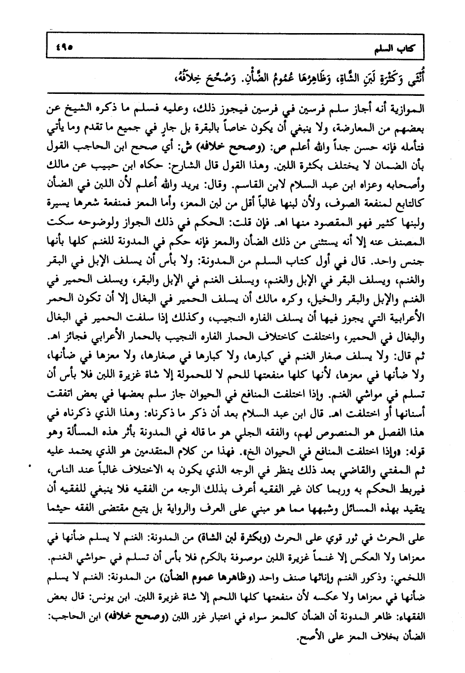 الموازية أنه أجاز سلم فرسين في فرسين فيجوز ذلك وعليه فسلم ما ذكره الشيخ عن بعضهم من المعارضة ولا ينبغي أن يكون خاصا بالبقرة بل جار في جميع ما تقدم وما يأتي فتأمله فإنه حسن جدا، والله أعلم. ص: (وصحح خلافه) ش: أي صحح ابن الحاجب القول بأن الضمان لا يختلف بكثرة اللبن، وهذا القول قال الشارح: حكاه ابن حبيب عن مالك وأصحابه وعزاه ابن عبد السلام لابن القاسم، وقال: يريد والله أعلم لأن اللبن في الضأن كالتابع لمنفعة الصوف؛ ولأن لبنها غالبا أقل من لبن المعز وأما المعز فمنفعة شعرها يسيرة ولبنها كثير فهو المقصود منها ا هـ. فإن قلت: الحكم في ذلك الجواز ولوضوحه سكت المصنف عنه إلا أنه يستثنى من ذلك الضأن والمعز فإنه حكم في المدونة للغنم كلها بأنها جنس واحد قال في أول كتاب السلم من المدونة: ولا بأس أن يسلف الإبل في البقر والغنم ويسلف البقر في الإبل والغنم ويسلف الغنم في الإبل والبقر ويسلف الحمير في الغنم والإبل والبقر والخيل وكره مالك أن يسلف الحمير في البغال إلا أن تكون الحمر الأعرابية التي يجوز فيها أن يسلف الفاره النجيب وكذلك إذا سلفت الحمير في البغال والبغال في الحمير واختلفت كاختلاف الحمار الفاره النجيب بالحمار الأعرابي فجائز ا هـ. ثم قال: ولا يسلف صغار الغنم في كبارها ولا كبارها في صغارها ولا معزها في ضأنها ولا ضأنها في معزها؛ لأنها كلها منفعتها للحم لا للحمولة إلا شاة غزيرة اللبن فلا بأس أن تسلم في مواشي الغنم وإذا اختلفت المنافع في الحيوان جاز سلم بعضها في بعض اتفقت أسنانها أو اختلفت ا هـ قال ابن عبد السلام بعد أن ذكر ما ذكرناه: وهذا الذي ذكرناه في هذا الفصل هو المنصوص لهم والفقه الجلي هو ما قاله في المدونة بإثر هذه المسألة، وهو قوله وإذا اختلفت المنافع في الحيوان إلخ فهذا من كلام المتقدمين هو الذي يعتمد عليه، ثم المفتي والقاضي بعد ذلك ينظر في الوجه الذي يكون به الاختلاف غالبا عند الناس فيربط الحكم به وربما كان غير الفقيه أعرف بذلك الوجه من الفقيه فلا ينبغي للفقيه أن يتقيد بهذه المسائل وشبهها مما هو مبني على العرف والرواية بل يتبع مقتضى الفقه حيثما