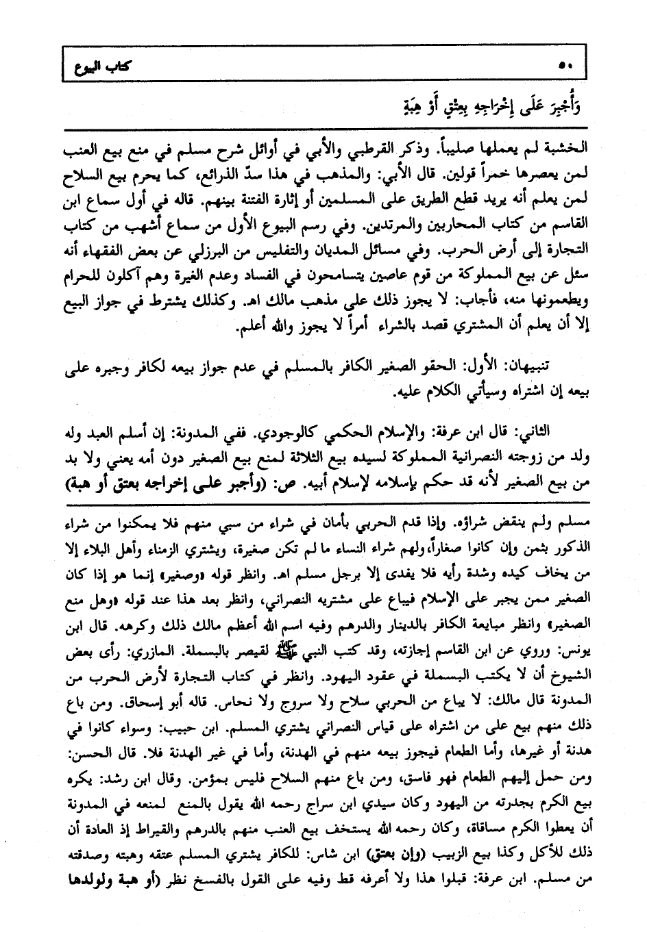 الثاني: قال ابن عرفة: والإسلام الحكمي كالوجودي ففي المدونة: إن أسلم العبد، وله ولد من زوجته النصرانية المملوكة لسيده بيع الثلاثة لمنع بيع الصغير دون أمه يعني، ولا بد من بيع الصغير؛ لأنه قد حكم بإسلامه لإسلام أبيه ص: (وأجبر على إخراجه بعتق أو هبة)